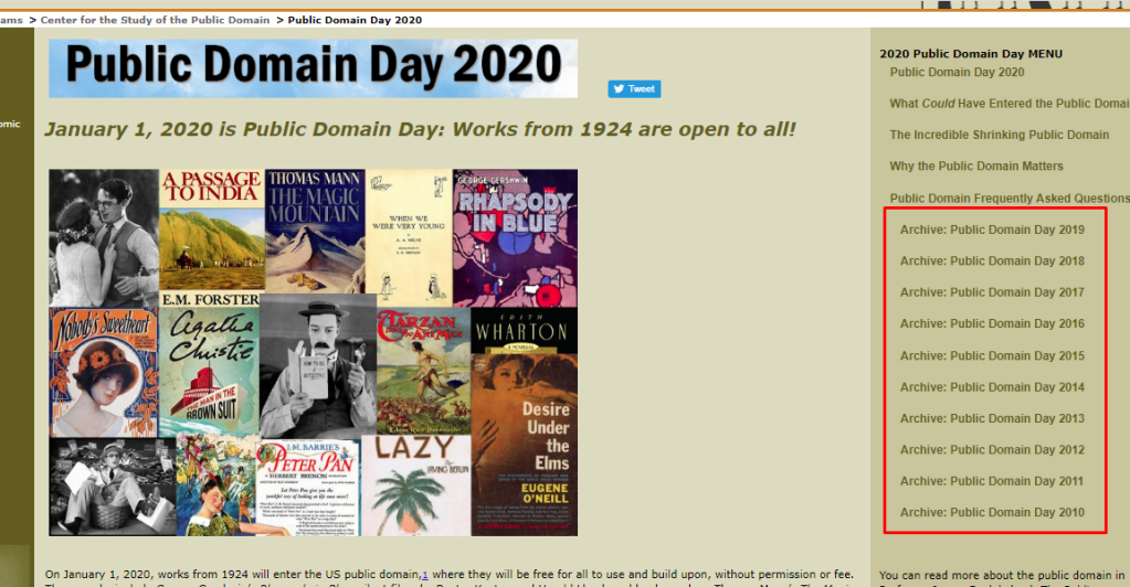 كما ترى في اليمين، ينشر الموقع كل عام مجموعة من الأعمال التي دخلت ضمن الملكية العامةكما تلاحظ في الصورة إحدى روايات أغاثا كريستي دخلت بالفعل في الملكية العامة بمعنى يمكنك ترجمتها وطبعها ونشرها وبيعها والاستفادة منها تجاريًا دون أي مشاكل قانونية. (حريّ بالذكر أن هذا لا ينسحب تلقائيًا على رواياتها الأخرى فالرواية المذكورة هنا صحيح متحقق من دخولها في الملكية العامة أما رواياتها الأخرى فتحتاج منك المزيد من البحث والتحقق).