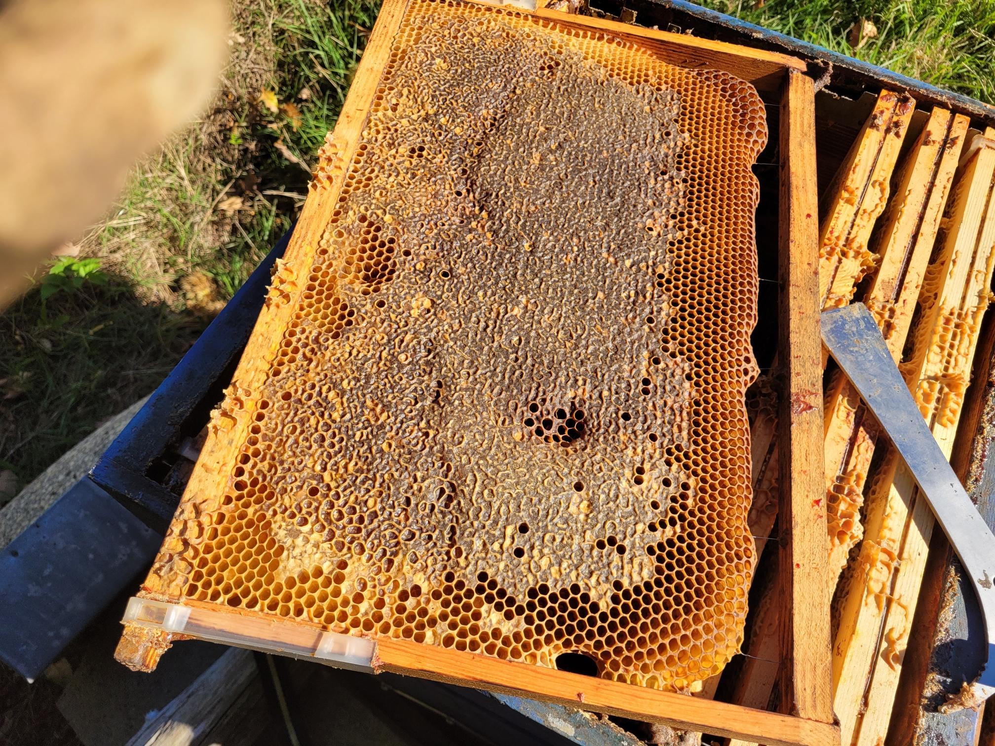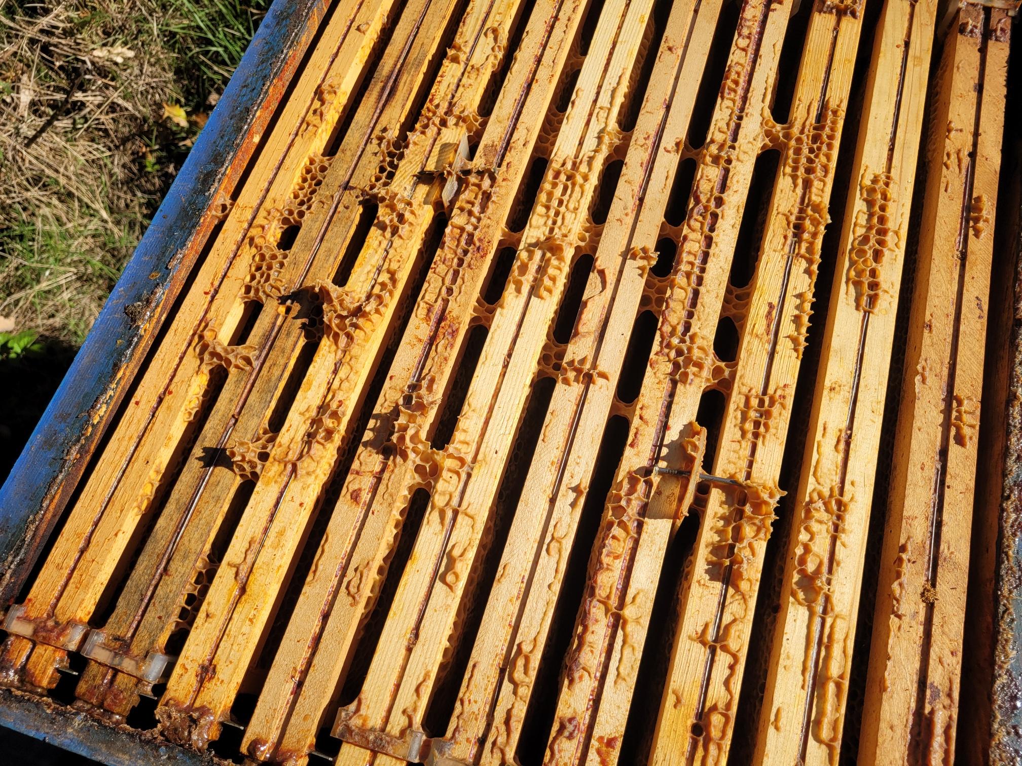 Enfin non : des cadres remplis de réserve de nourriture, le couvain est presque entièrement décimé, plus une abeille vivante : les frelons asiatiques les ont exterminées. La pression est telle qu'ils ont réussi à rentrer et tout détruire.