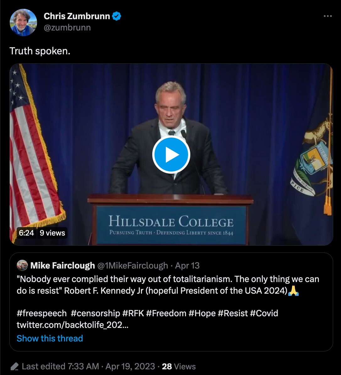 7. Chris Zumbrunn's statement is vague and rubbery and does not make things clearer to the least. Meanwhile @zumbrunn on Twitter RTs Elon Musk, RFKjr (see bellow, in the video RFKjr compares Fauci to Dr. Mengele), Kim Dotcom and other right wing libertarians. He was involved in the ableist, antisemitic and fascist Anti-Mask Anti-Vaxx protests in Bern. And incidentally it was him who was the one that side lined me for four months by not responding to my emails where i was trying to fight for masks at the organizational meetings and the RIA. Coincidence? Plus Chris he often sounds like a conspiracy theorist. He cannot be involved in an anarchist gathering.