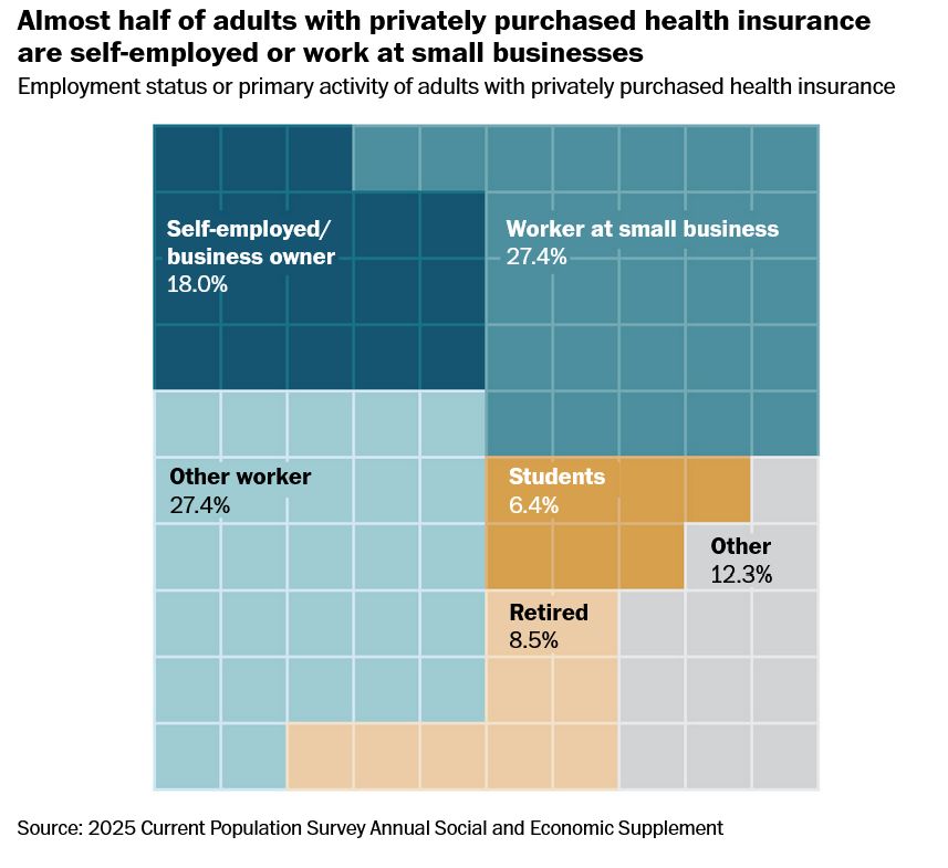 Nearly half of the adults on ACA marketplace plans are self-employed, small-business owners or small-business employees, according to an analysis from KFF, an independent health policy research organization. While most Americans get their health insurance through their employer, those who work for small businesses (or themselves) often have to rely on the exchange.