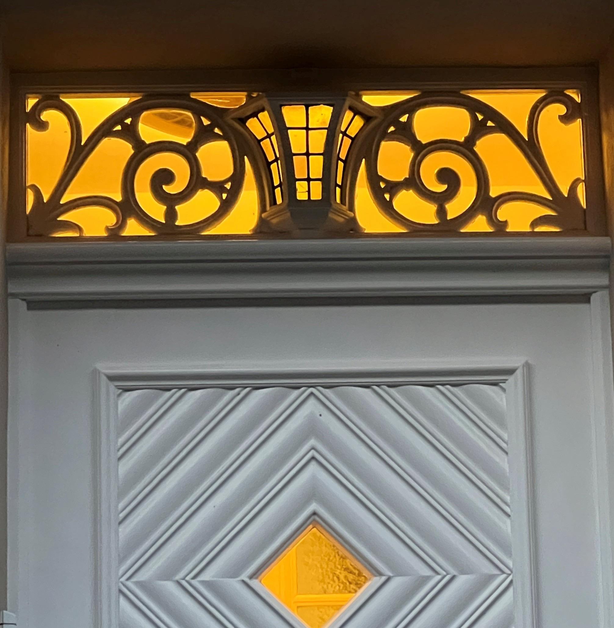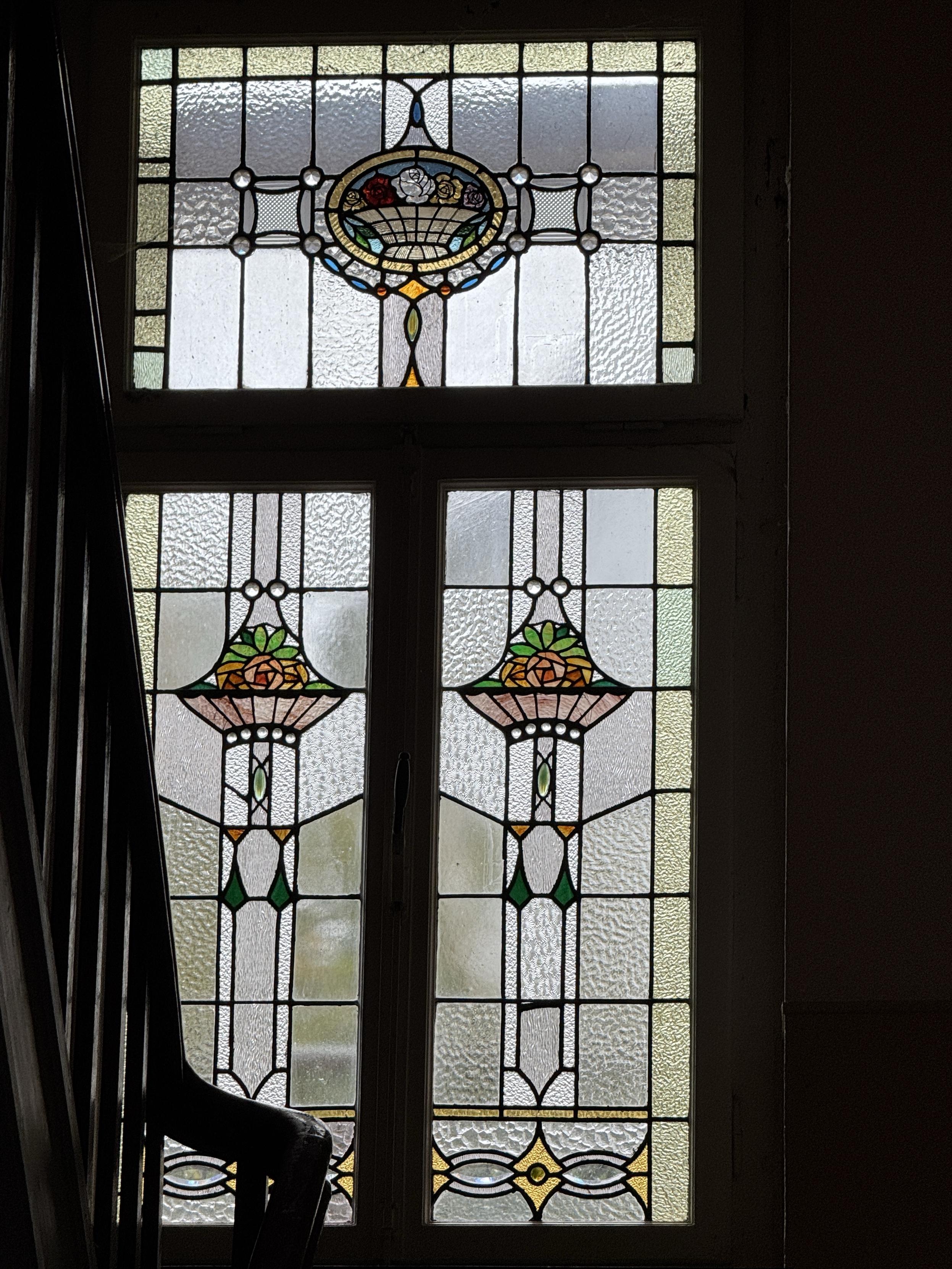 Diese unglaublichen Bleiverglasungen befinden sich in einem ansonsten unscheinbaren mehrstöckigen Reihenhaus . Man muss daraus schließen, dass es einmal ein gehobenes Haus in der Zeit des Jugendstil war und wohl nach dem Krieg kaputt saniert worden ist. Im zweiten Foto seht ihr ein Ausschnitt der Straße, an dem man ansatzweise erkennen kann, dass das früher mal schöne Fenster gewesen sein müssen.