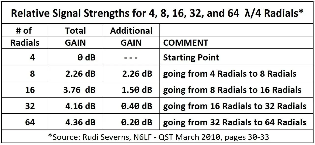 The chart above shows the relative gain achieved when adding additional radials beneath a full-size quarter-wave vertical.*