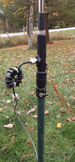 Custom, ham-made (by me) support pole.As I write this we are well into fall. The winter months still lie ahead of us – 7 months of dreary, snowy, icy weather. So I took advantage of cool temperatures and still unfrozen ground to test my top-loaded shortened whip. I mounted the whip on my recently constructed support that uses PVC plumbing bits and part of a fiberglass driveway marker driven into the ground. For lucky readers in the southern states and other milder climates, a driveway marker is a thin pole used to identify the edges of a driveway when the snow comes. I use 5ft markers, and during last winter’s unusually heavy snowfall, they disappeared deep beneath the snow banks left by the snow plows on their daily runs. I gotta move to sunny Florida, snakes and gators be damned!