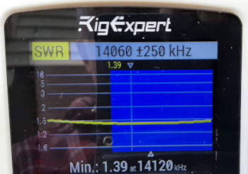 For this initial backyard test I used a set of four 13ft radials that lie mostly on the ground. I know this isn’t the most efficient way of providing the “other half” of an antenna. I have now improved on that by extending the support pole to 43 inches (109cm) and replaced the ground radials with two sloping, above ground radials with links for 15m, 17m and 20m.