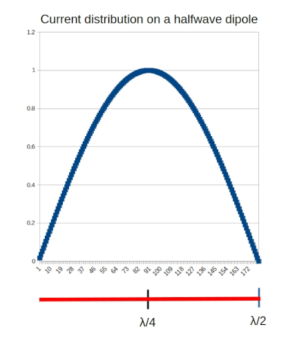 Let’s assume we are using a field portable version of the POTA PERformer in which the feedpoint remains quite close to the ground – maybe 1 to 1.5 meters. The two radial wires slope away from the feedpoint to an end point even lower to the ground. Now, if we examine the current distribution on a halfwave dipole, we can see that the maximum current, and therefore the point at which maximum RF is radiated, is located in the center of the dipole.