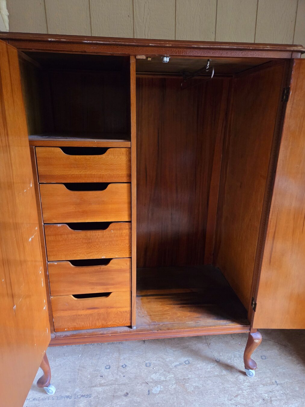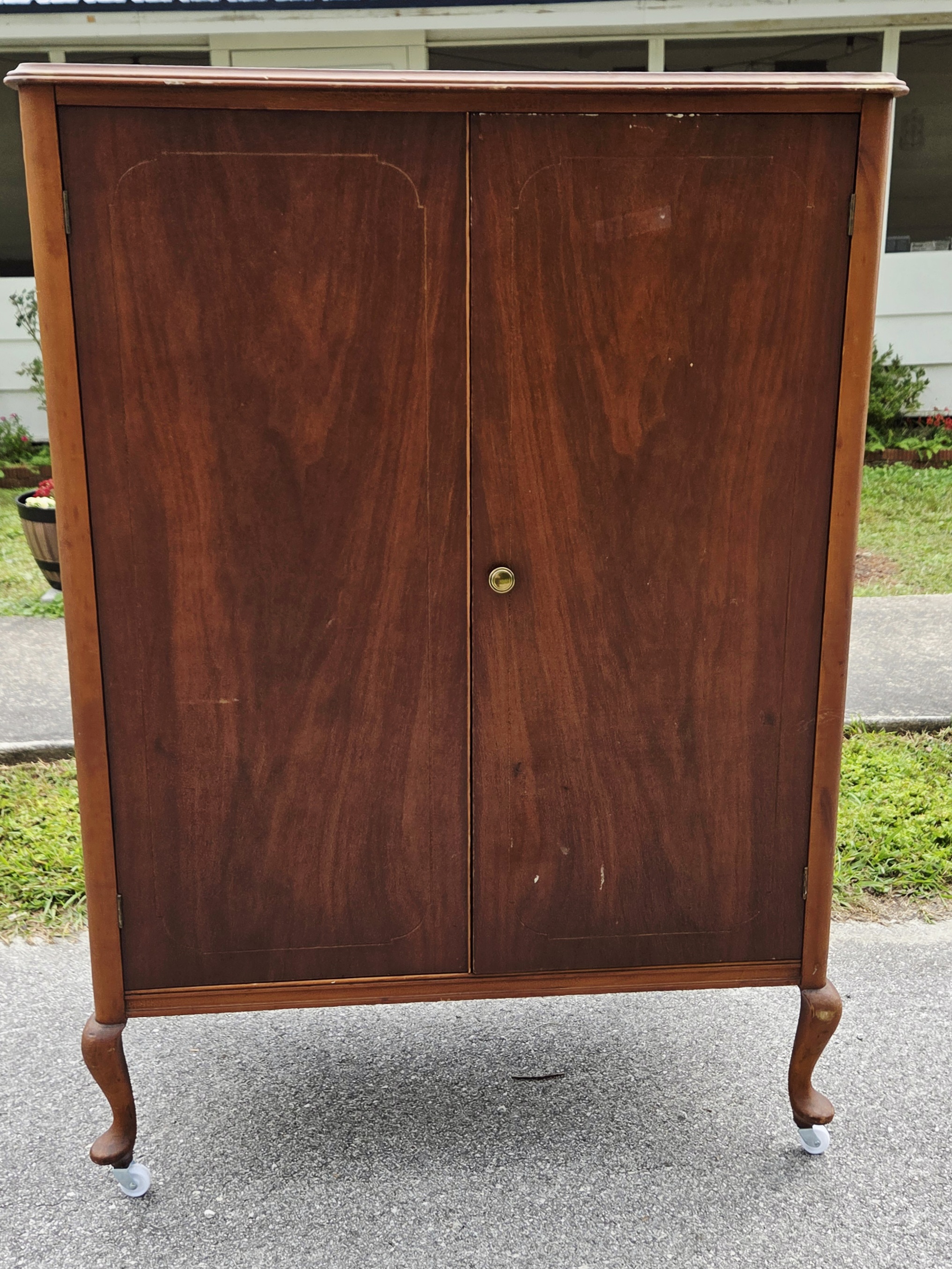 With its cabriole legs, deep wood tones, and quiet history, it feels right at home here in the mountain but I am convinced this was built in the Midwest. I bought it over a decade ago during an auction of from Detroit. It used to store my sons Skylanders and video games.