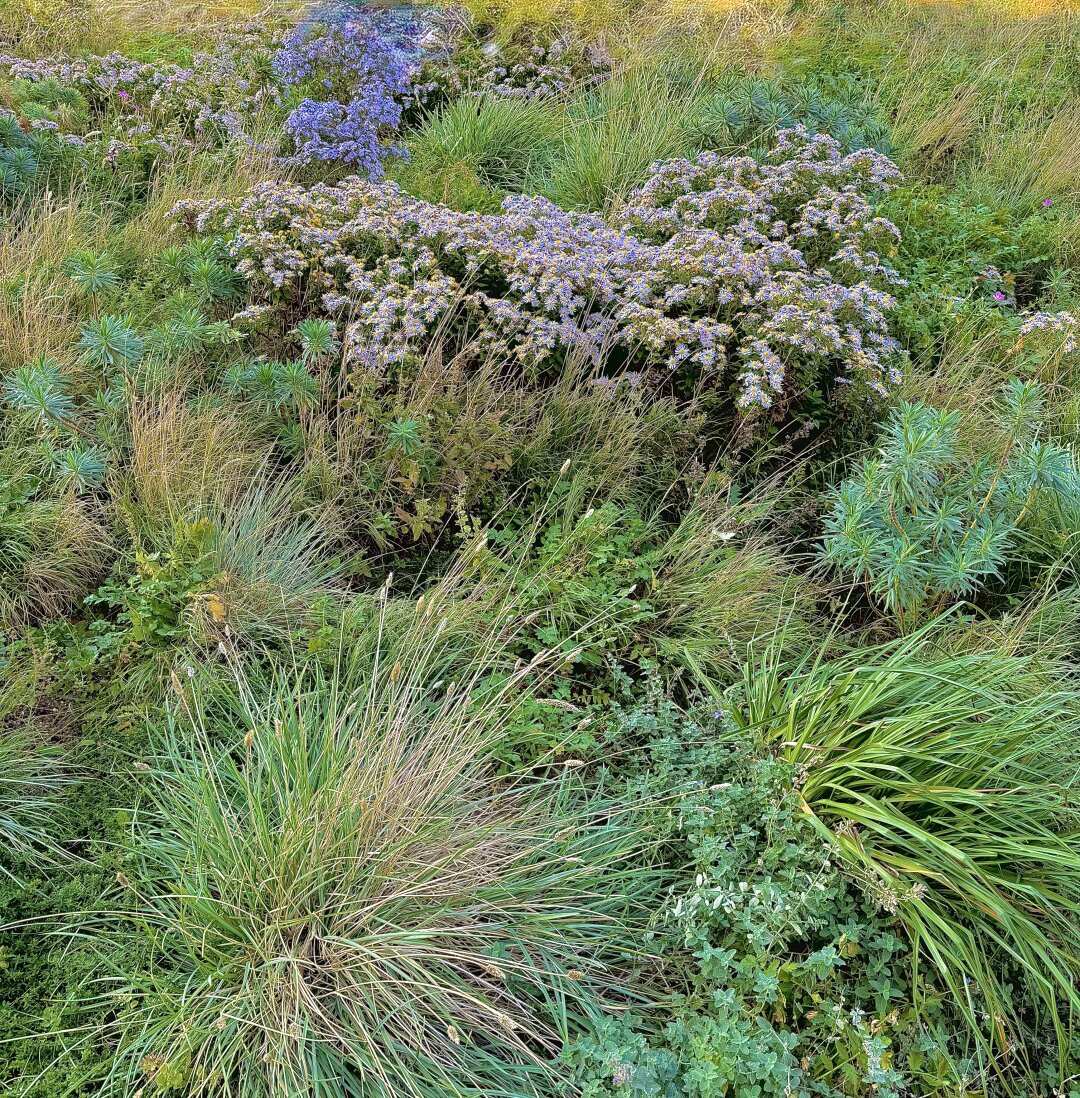 These wood asters look purple up close but kind of pale blue or white from afar. They bloomed late this year.