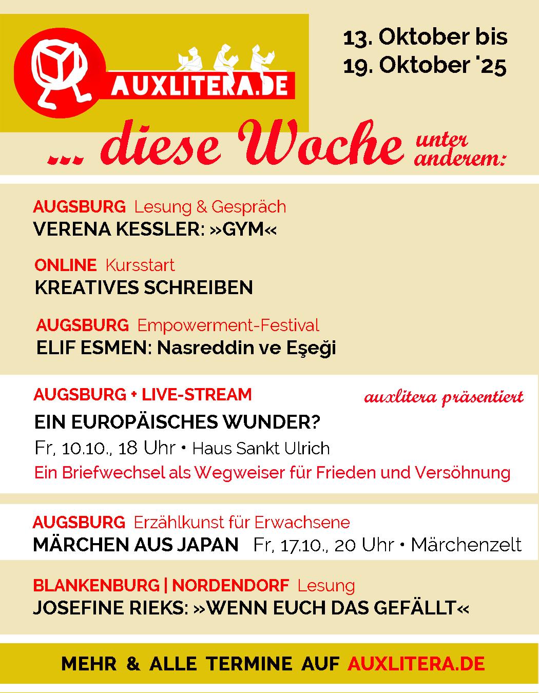 Literaturtermine in Augsburg und Region für die Woche ab Montag, 13.10.: jetzt den auxlitera-Veranstaltungskalender auf ★ https://auxlitera.de/ checken! Ein kleiner Einblick in der Grafik.
