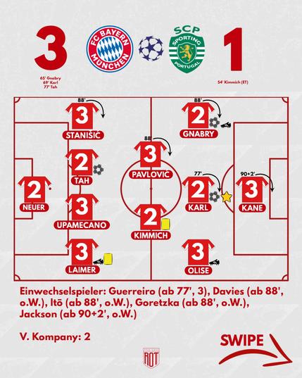 Nach einem überraschenden Rückstand kurz nach Beginn der zweiten Halbzeit, drehte der FC Bayern gegen Sporting die Partie zu seinem Gunsten. Miasanrot mit den Noten. #fcbayern #bayern #bayernmünchen #bayernmunich #championsleague