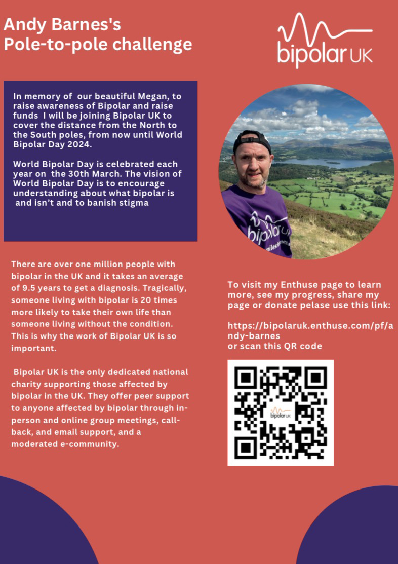 I’m taking part in Bipolar UK’s #poletopolechallenge as me and other supporters look to cover the distance from the North to South Pole by March 30th, 2024 which is world bipolar day.