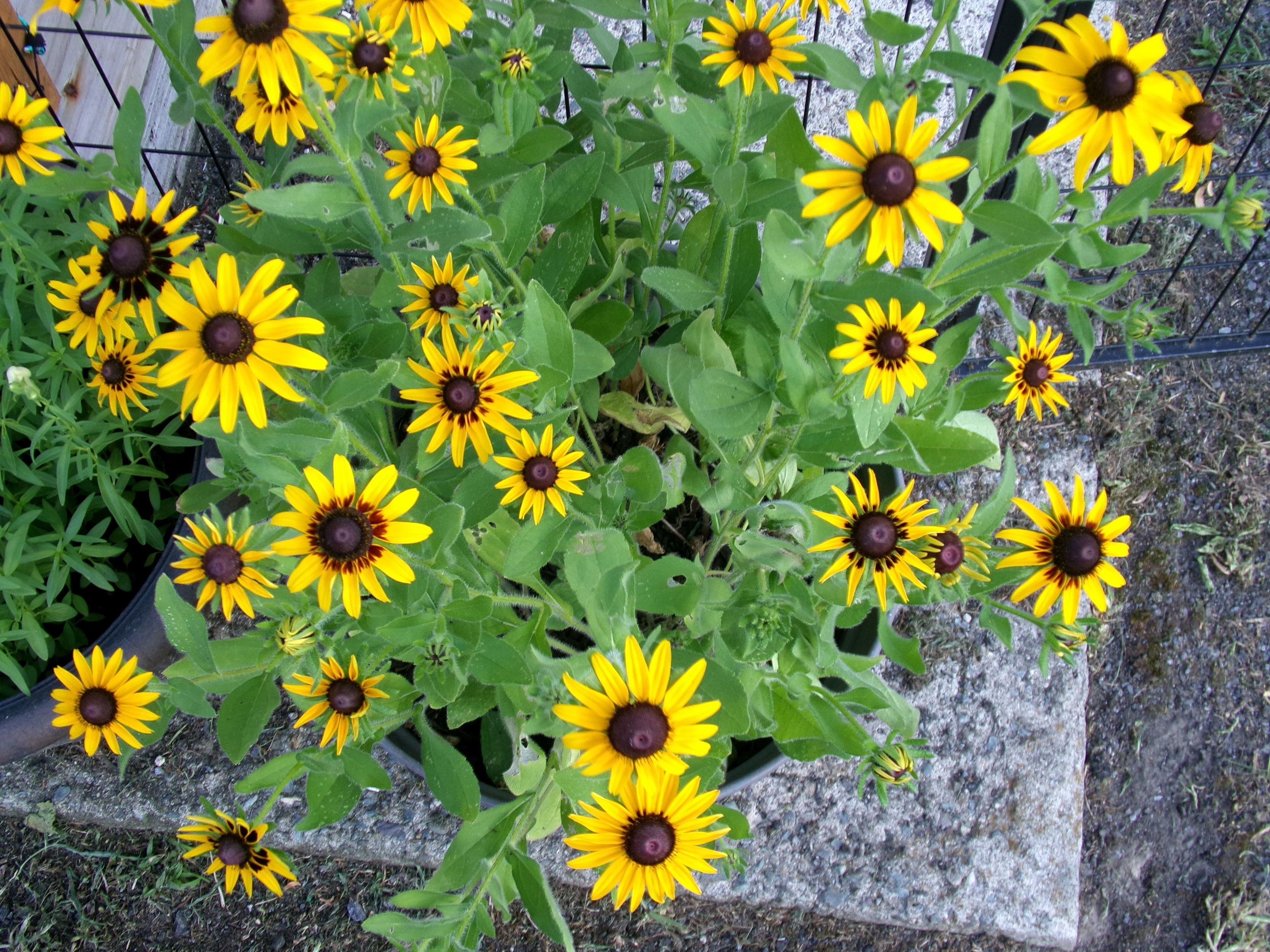 Black-eyed Susans, Rudbeckia hirta reinstated in my hillside flower bed after much unfruitful war weeding out the fish mint. Plan to do another sowing in the fall.