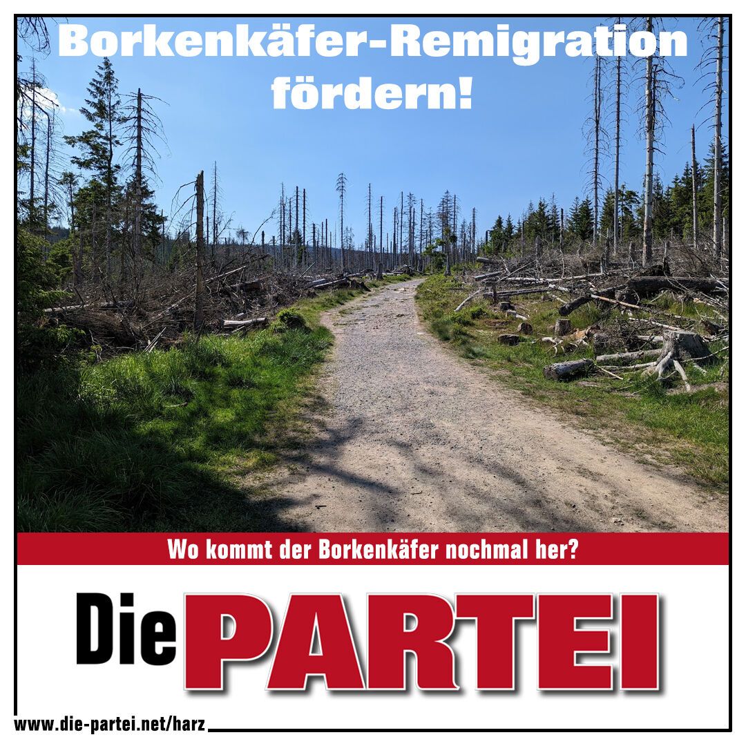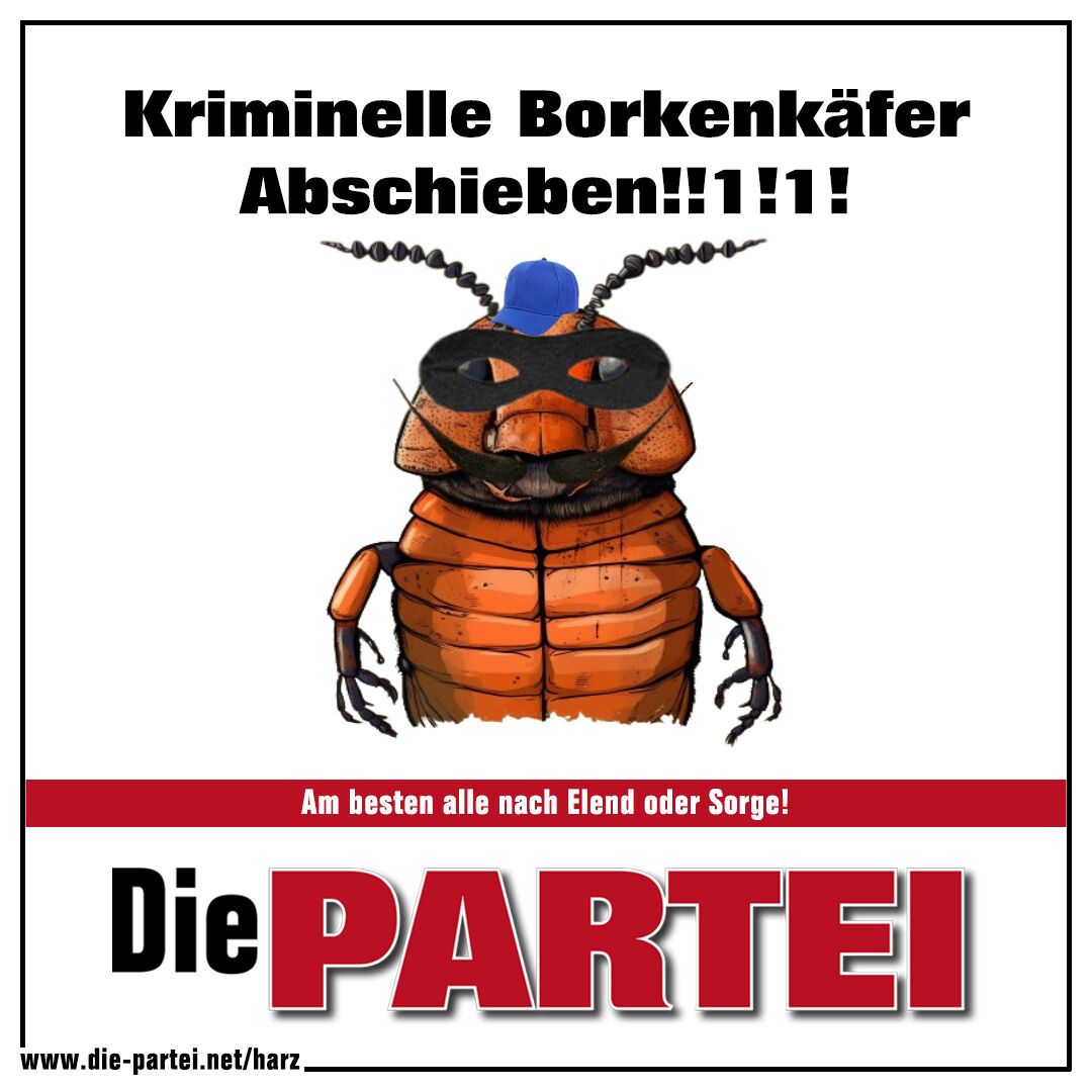 Die Borkenkäfer die den Wald zerstören müssen endlich abgeschoben werden !1!1 Die Politik duldet diese Butterbrotmesser Tragenden Bruchdruckkäfer viel zu lange !1!Es ist genug damit , wählt uns und wir werden diese Käfer irgendwohin abschieben , am besten nach Elend oder Sorge , wo Sie im Elend und Sorge leben werden !1!1!1 #borkenkäfer #harz #wald #klima #kriminell #rinde #borke #buchdruck #buchdruckkäfer #abschieben #genugistgenug #remigration #elend #sorge #natur #scheißnatur #DiePARTEI