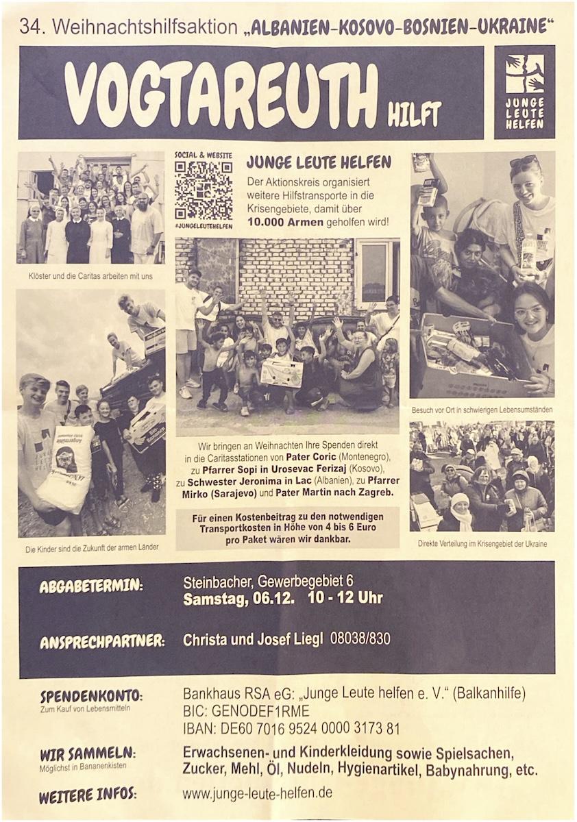 Bei uns im Pfarrverband startet jetzt dann die #Kosovo-Sammlung von https://www.junge-leute-helfen.de/. Los geht es am 29. November in #Prutting, dort können Spenden 9–12 Uhr an der Thusbaß-Halle angeliefert werden (Gewerbering 7). Eine Woche drauf, am 6. Dezember, geht es in #Vogtareuth weiter. Dort ist der Sammelpunkt beim Steinbacher (Gewerbegebiet 6) 10–12 Uhr besetzt. Gesammelt werden in erster Linie Erwachsenen- und Kinderkleidung sowie Spielsachen, Zucker, Mehl, Öl, Nudeln, Hygieneartikel, Babynahrung etc., und zwar am besten in Bananenschachteln verpackt.