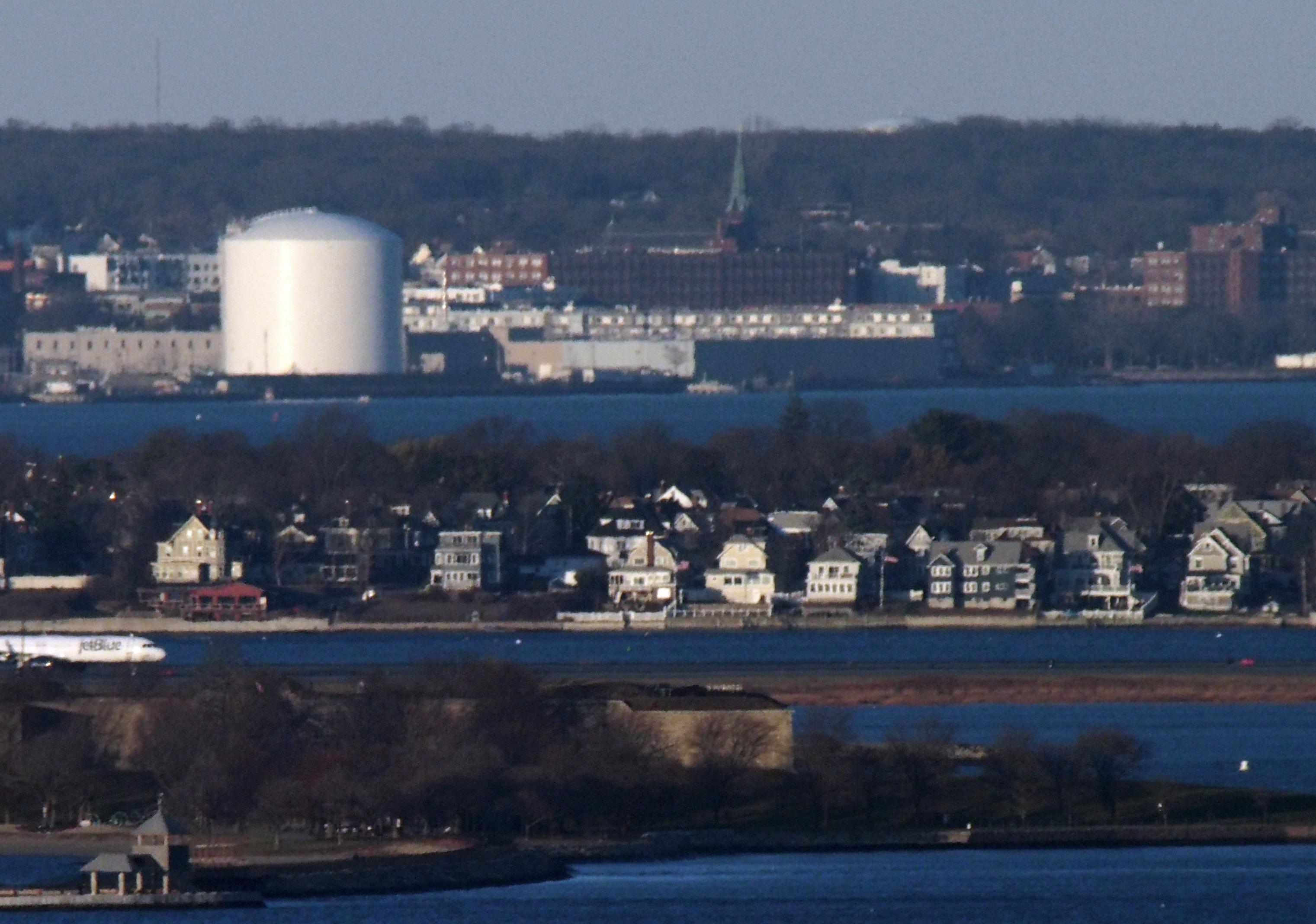 This photo is a great example of the stripes of land and water that form Boston Harbor. The first strip of land below has several houses visible, inclusing several on Lorean Terrace that are in Winthrop MA. The next strip of land is part of the runway for Logan Internation Airport, East Boston MA and to the left of frame a Jet Blue airliner can be seen. Below that is Castle Island, with a view of parts of Fort Independence. While most of the fort is behind trees, the structure can be made out through the bare branches. Below that is Head Island which has what looks like a lookout tower at the tip.