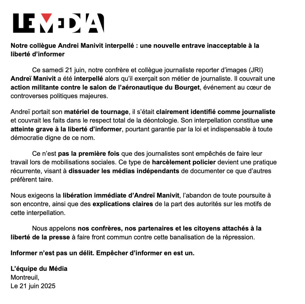 đš ALERTE ! Notre confrĂšre Andrei Manivit a Ă©tĂ© embarquĂ© en garde Ă vue alors quâil couvrait une action contre le salon du #Bourget.