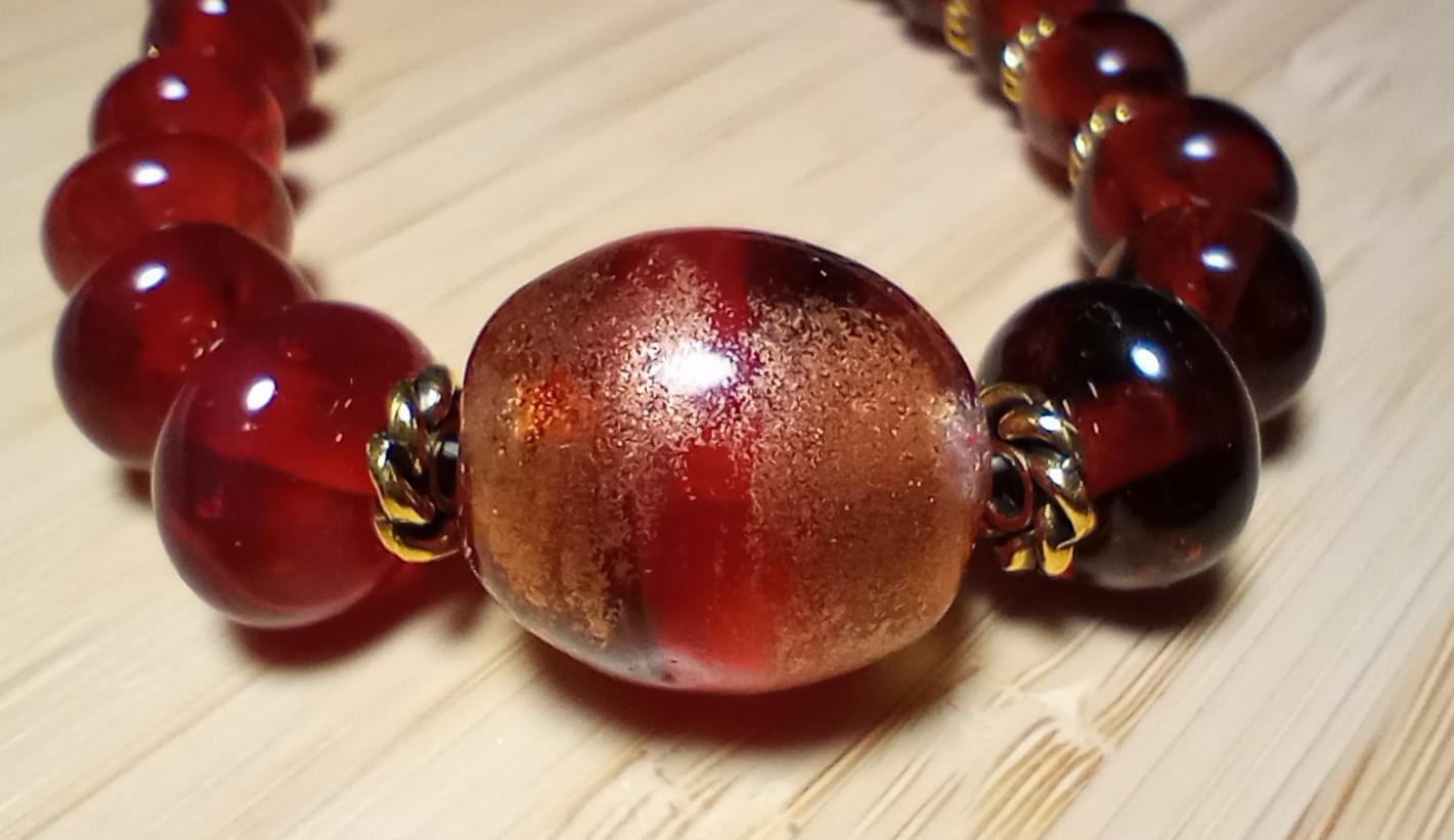 Image of my handmade lampwork hot glass necklace in transparent red and topaz, with brass spacers and toggle, and a large focal bead at the center, enhanced with gold colored mica fused to the glass, held in my open palm, set against a light wood background.Image of my handmade lampwork hot glass necklace in transparent red and topaz, set against a light wood background.Close up image of the focal bead from my handmade lampwork hot glass necklace in transparent red and topaz, set against a light wood background.