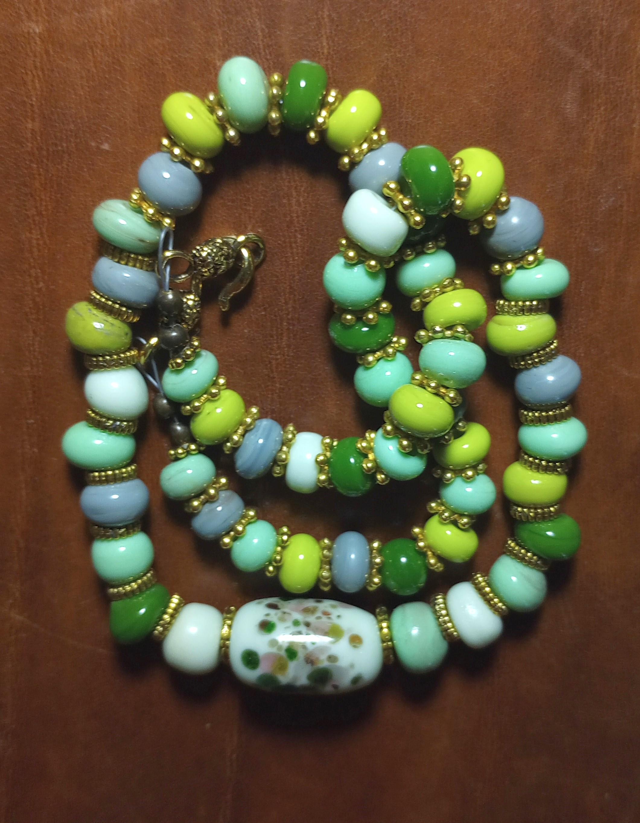 A handmade lampwork glass bead necklace  in shades of green and grey, set against a yellow fabric background.A handmade lampwork glass bead necklace in shades of opaque green and grey, set against a dark wood background.