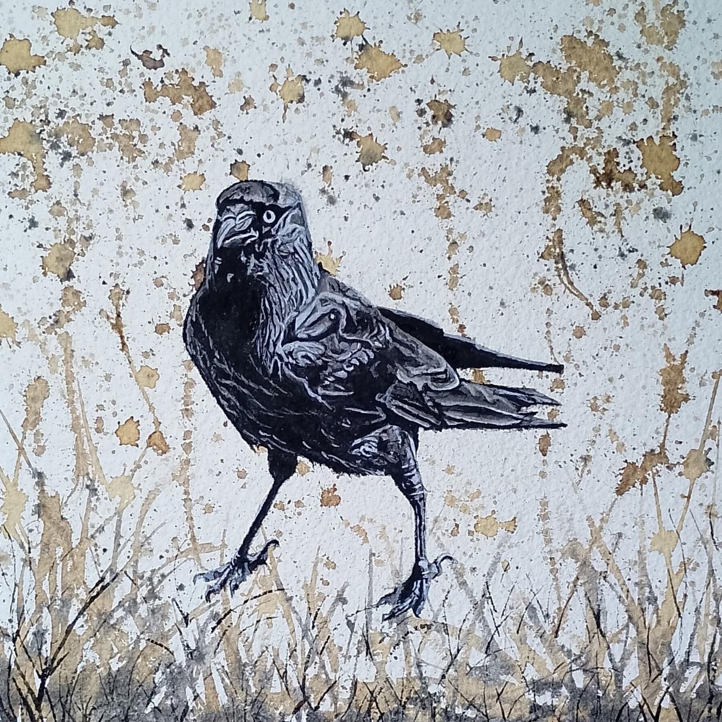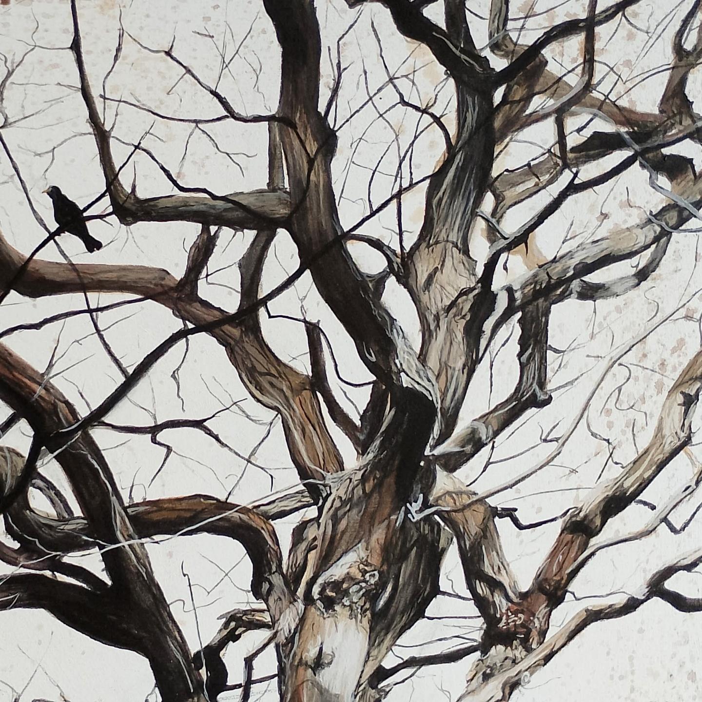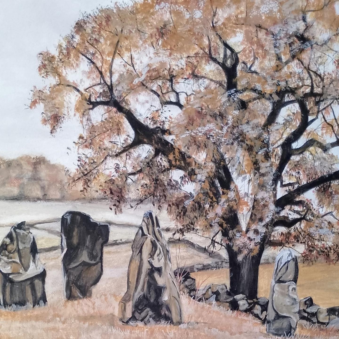 Painting of a corvid looking at the viewer. The background is slightly abstract representin grasses and in natural colours of beige/brownPainting of a bare tree in natural colours, looking up into the canopyPainting of a tree with three standing stones to the left and one to the right. The tree is in leaf, they are brown/orange. Behind are fields and a distant row of treesART IN THE ROSE GARDENS AT HOPTON HALL