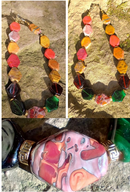 Collage of 3 photos of a handmade lampwork glass bead necklace, featuring hexagonal beads in a range of earth tones, set against a sunlit slab of sandstone.