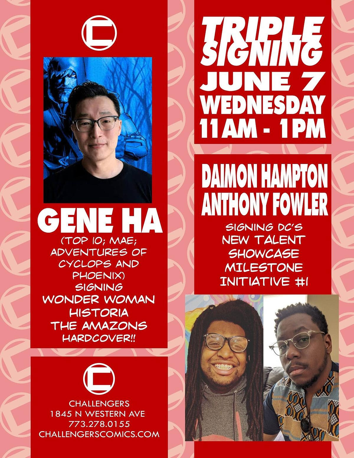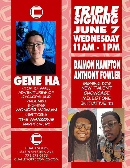 “This is a STRONG week of New Releases, highlighted by 3 creator signings at the same time! Wednesday morning, right at 11am we’ll have GENE HA signing WONDER WOMAN HISTORIA THE AMAZONS HC and both DAIMON HAMPTON and ANTHONY FOWLER signing the NEW TALENT SHOWCASE MILESTONE INITIATIVE #1!! This kicks off a summer filled with amazing creator events at Challengers, and you can be at ALL of them!!”