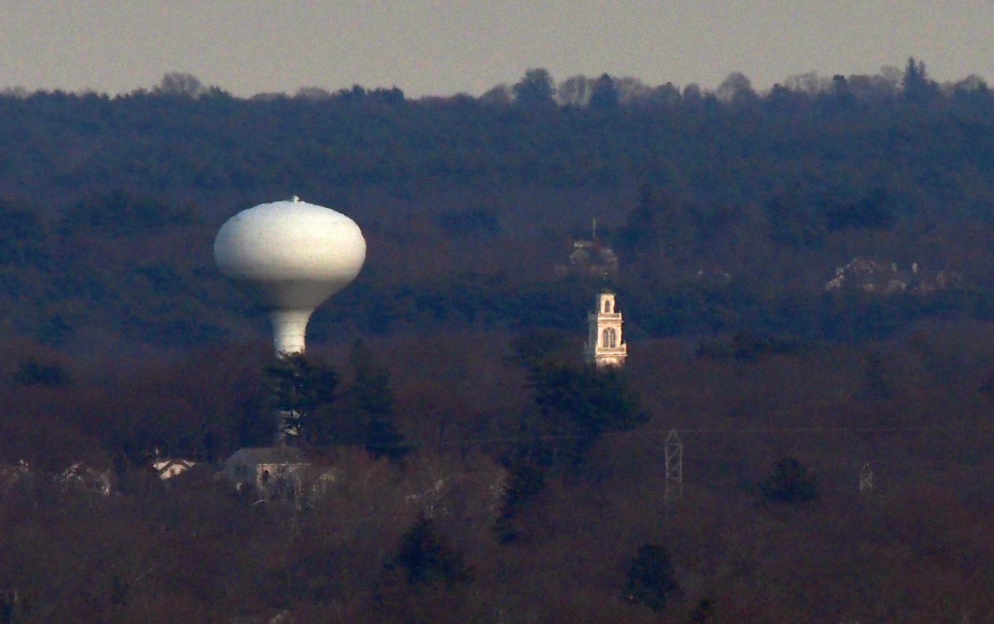 Unfortunately, this beautiful stone tower lies in an almost direct line with a not so beautiful communications tower, Needham Recycling and Transfer Station, 1421 Central Ave, Needham MA about 10.3 miles away. I took a stab at removing the comm tower using photoshop, so I have included that here as well, but full disclaimer that the first photo is the true depiction.