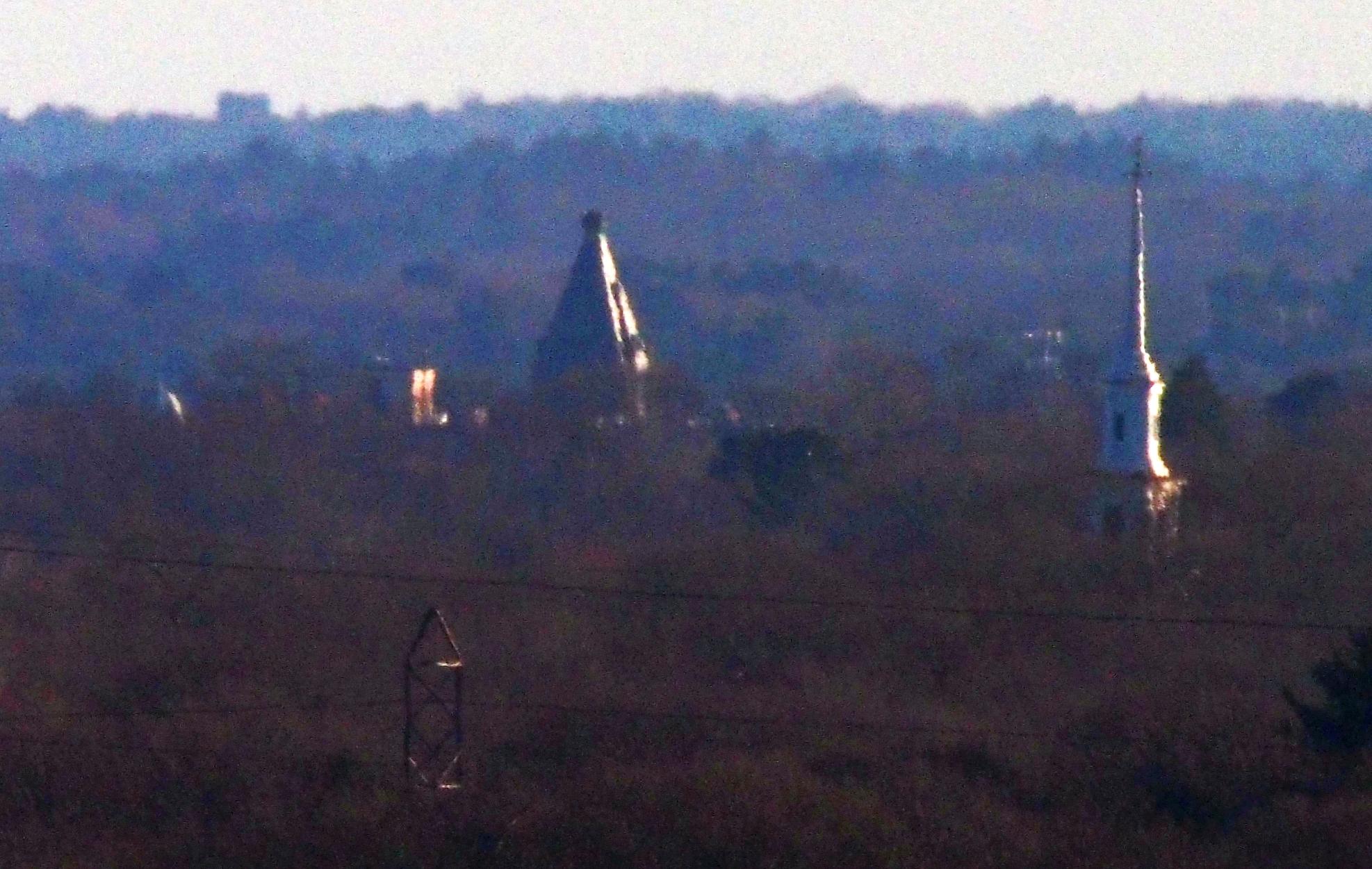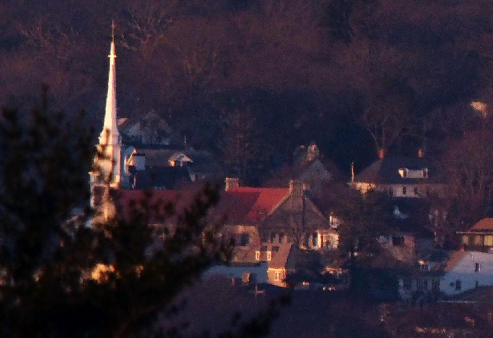 In front of the church there are four light towers that can be seen that are part of White Stadium (6.64 mi), 450 Walnut Ave, Mattapan MA. The lights are aligned almost perfectly edge-on from the perspective of Buck Hill.