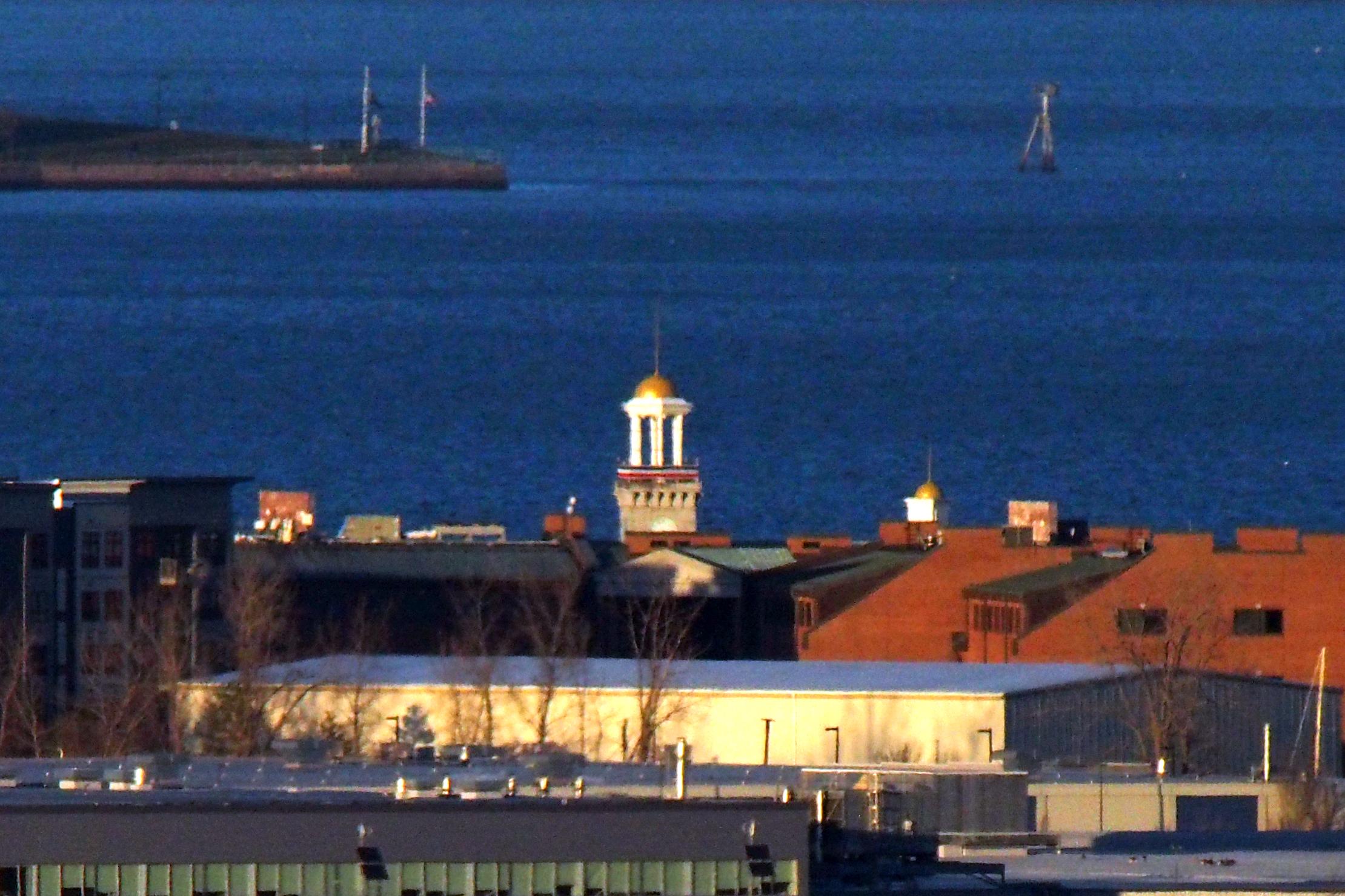 To the right of the South Boston memorial there is some kind of man-made structure on the water that I cannot find any name for. I suspect it is some kind of navigational beacon. It can be seen in Google 360 photos from Castle Island. The large beige shed like structure in front of the Clock Tower is a film studio and sound stage. Marina Studios, 260 Victory Rd, Quincy MA.