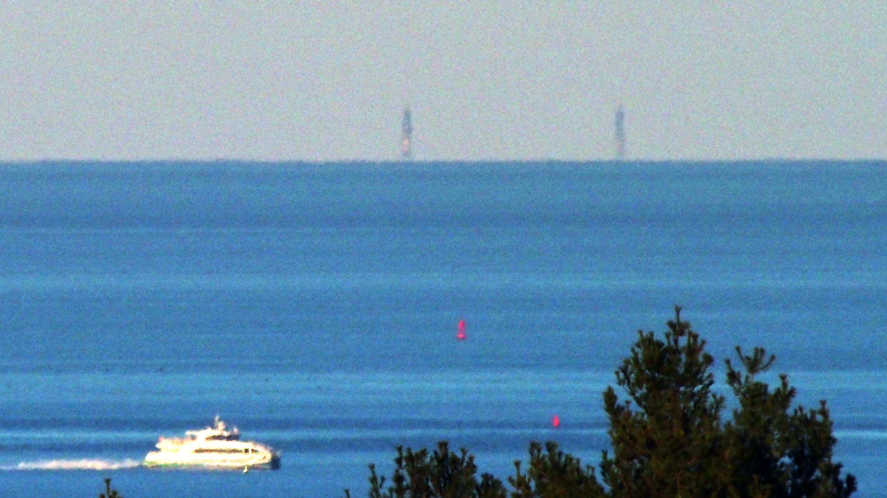 This has proven to be a challenging photo to capture. This looks over a lot of water and even on the days when things are crystal clear, the ocean often has fog, haze or excessive turbulence. To see this also requires positioning oneself on very particular parts of Buck Hill. Near the summit, the view of the lighthouses is obscured by Chickatawbut Hill (which can be seen at the bottom of the frame).