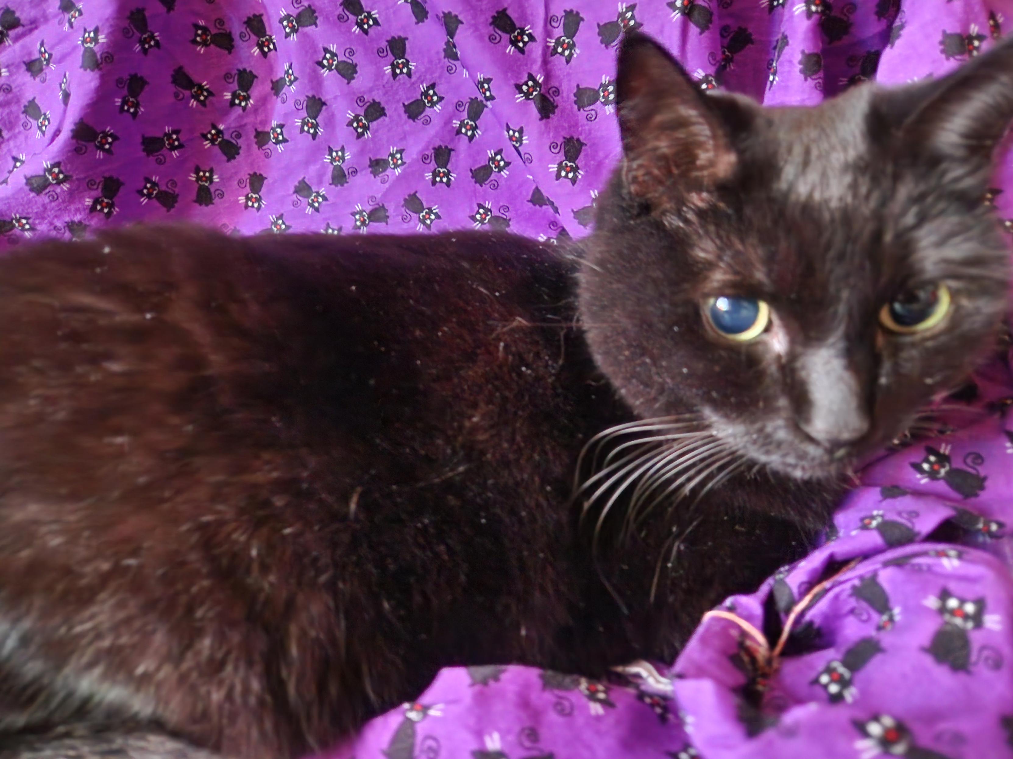 I just found Vita looking cozy in the sewing room... with black cat fabric.