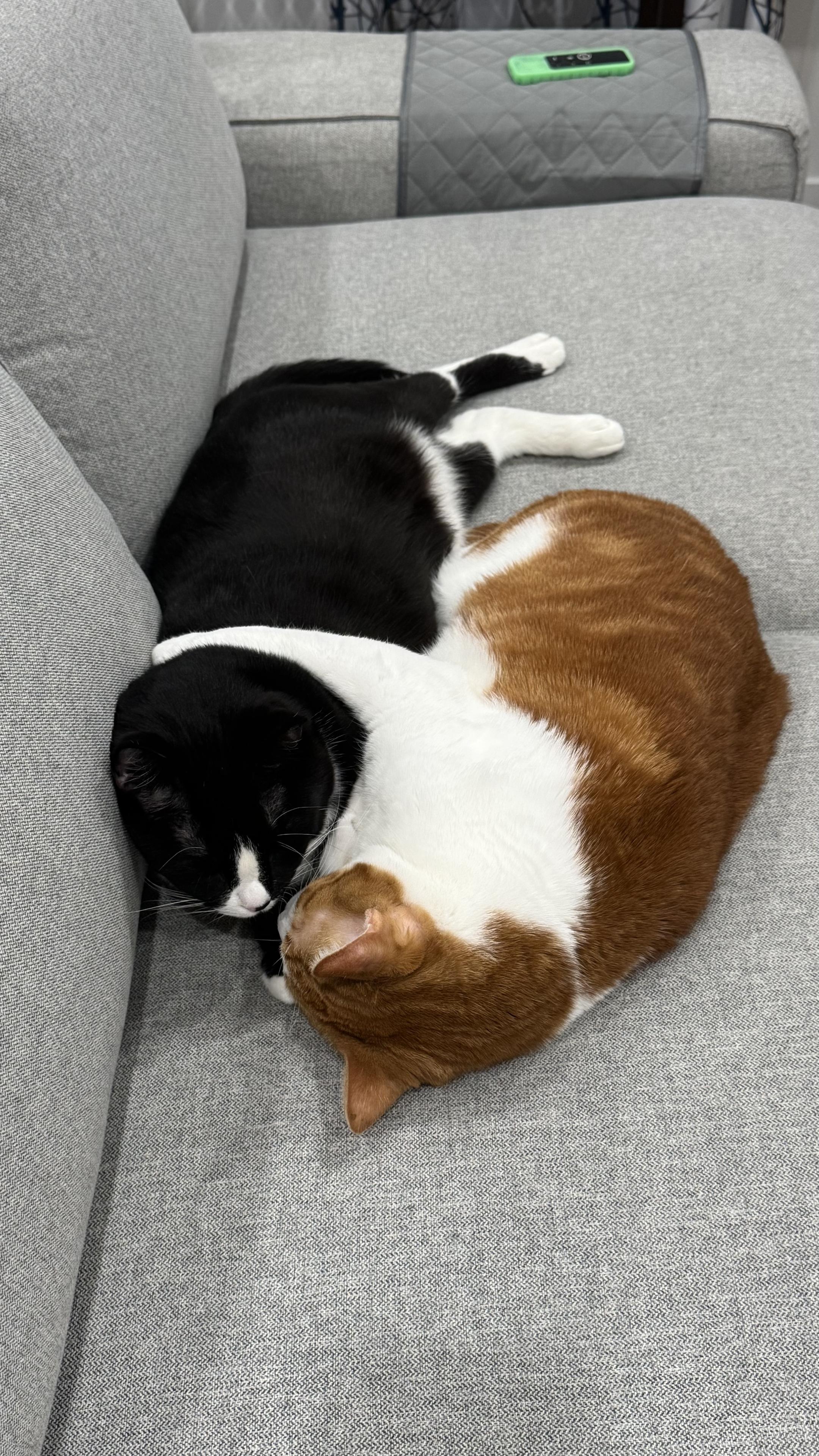 Sylvester (Tuxedo) wasn't thrilled when he woke up to find Simon (Orange) like this. #Cats #CatsOfMastodon #OrangeCats #TuxedoCats