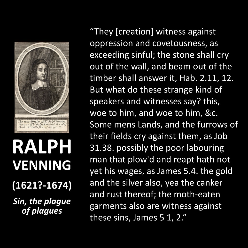 ![RALPH VENNING (1621?-1674) Sin, the plague of plagues "They [creation] witness against oppression and covetousness, as exceeding sinful; the stone shall cry out of the wall, and beam out of the timber shall answer it, Hab. 2.11, 12. But what do these strange kind of speakers and witnesses say? this, woe to him, and woe to him, &c. Some mens Lands, and the furrows of their fields cry against them, as Job 31.38. possibly the poor labouring man that plow'd and reapt hath not yet his wages, as James 5.4. the gold and the silver also, yea the canker and rust thereof; the moth-eaten garments also are witness against these sins, James 5 1, 2."](https://files.mastodon.social/media_attachments/files/115/638/179/267/361/843/small/f77f7448787e2401.png)