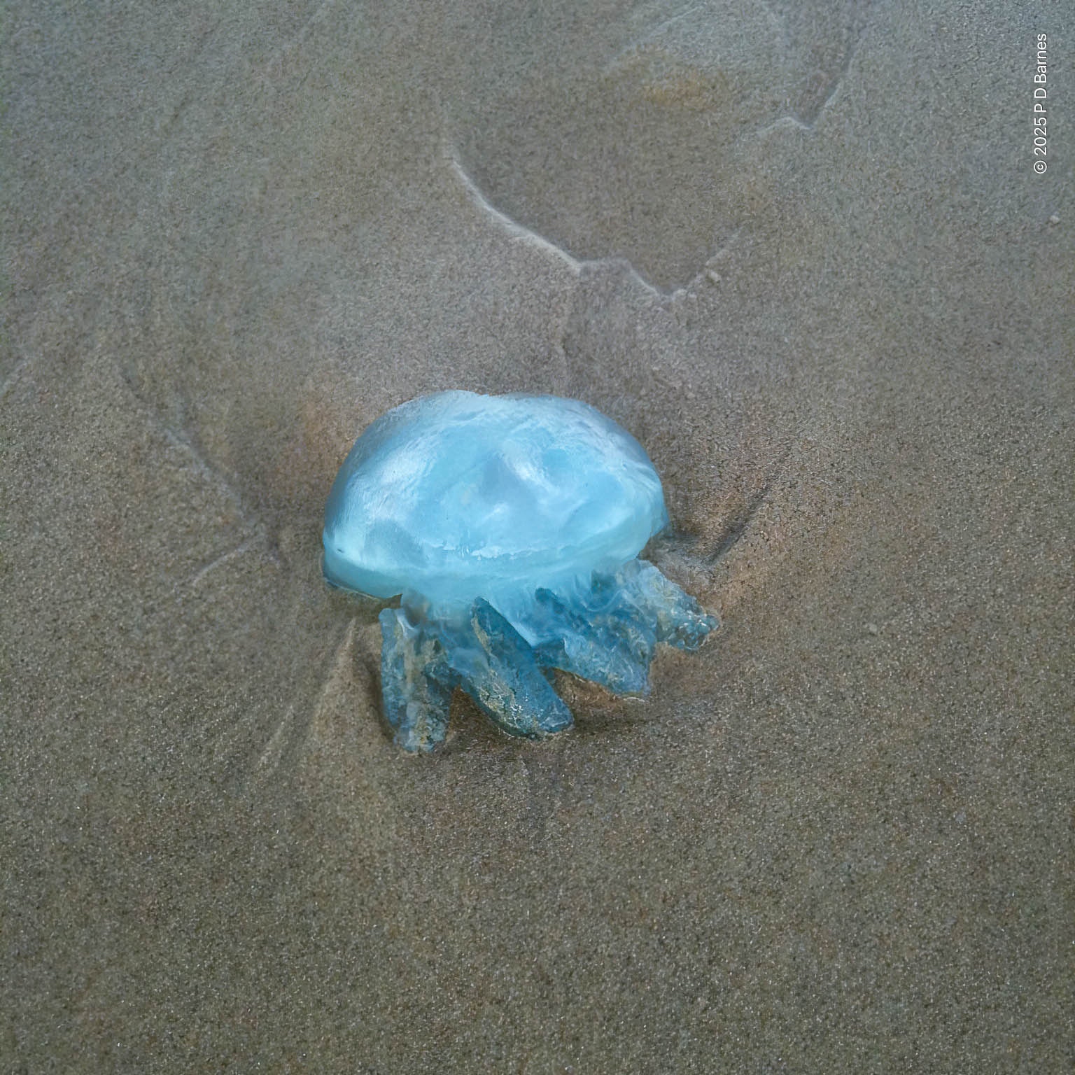 A small, beautiful blue jellyfish washed up on the beach.