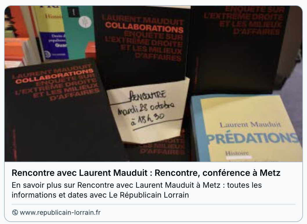 #Metz: Rendez-vous mardi à 18H30 à la librairie "Autour du monde", pour un échange autour de "#Collaborations - enquête sur l'extrême droite et les milieux d'affaires".