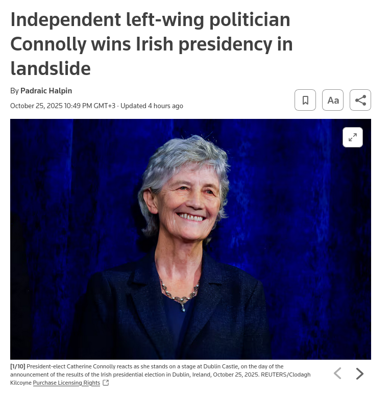 Connolly vince a valanga le elezioni presidenziali in Irlanda | Notizie elettorali | Al Jazeera https://www.aljazeera.com/news/2025/10/25/connolly-set-to-be-irelands-next-president-after-rival-concedes-defeat