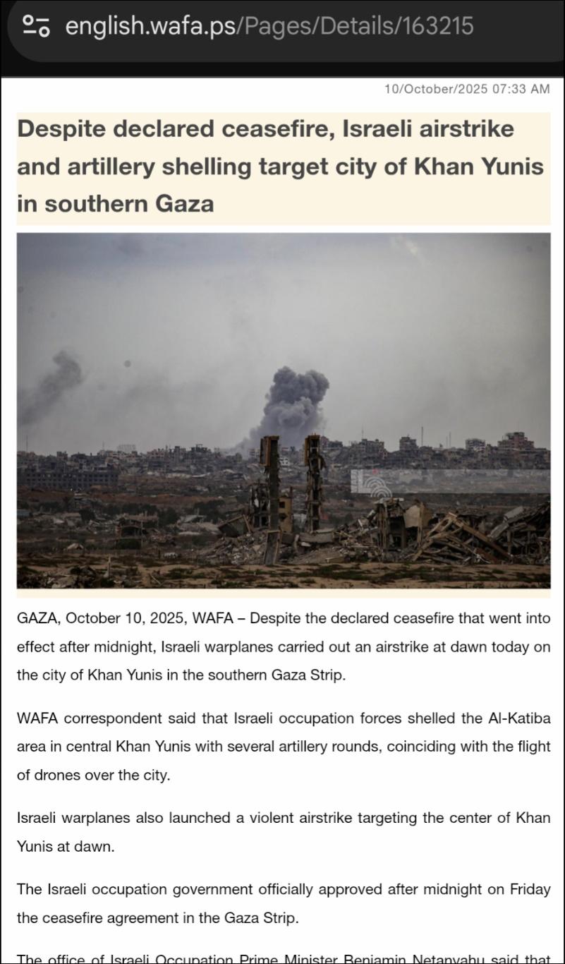 GAZA, October 10, 2025, WAFA – Despite the declared ceasefire that went into effect after midnight, Israeli warplanes carried out an airstrike at dawn today on the city of Khan Yunis in the southern Gaza Strip.