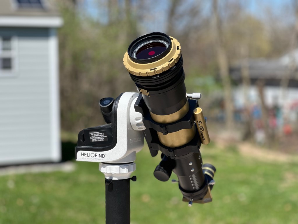 The Sky-Watcher SolarQuest mount is shown here aiming our Coronado 60mm hydrogen-alpha solar telescope at Sun.Aiding in our efforts was a device we used for the very first time in this session: The Sky-Watcher SolarQuest with its HelioFind system. The device is lightweight, easily supported our rather robust Coronado solar telescope, and was exceptionally easy to learn and operate. Essentially, all that was needed was to set the tripod up so that it was level, turn the device on, and let it do its thing! It is powered by four AA batteries, placed inside the unit. As an alt-az mount, no counterweights or muliti-axis balancing was needed; just mount the scope with its balance point at the center of the dovetail clamp. No remote control, no app, the compact and self-contained SolarQuest established GPS contact, leveled the scope, then looked for Sun. The SolarQuest turned and elevated the telescope, quickly acquiring our nearest star. When the motion stopped, we looked through the eyepiece to discover Sun well within the field of view. A few nudges of the system’s adjustment buttons and Sun was centered. Tracking was excellent throughout the observing/imaging session. Provision is made for further refinement of tracking but that adjustment was unnecessary for the day’s activity. The SolarQuest will make our daytime astronomy a whole lot more convenient and enjoyable!