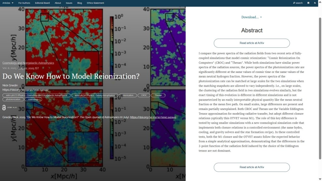 It’s Saturday again, so it’s time for the usual update of the week’s new papers at the Open Journal of Astrophysics. Publishing this week was interrupted by the Thanksgiving holiday in the United States, which meant there were no arXiv announcements yesterday. Nevertheless, since the last update we have published another four papers, which brings the number in Volume 8 (2025) up to 184, and the total so far published by OJAp up to 419.
