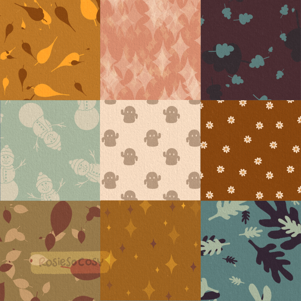 I’m chronically overwhelmed, and by extension chronically late with my entries. 😅 Despite the chaos, it was a good day! Just really tiring. I started with 15min left until midnight. Whoops! I used my own designed, hand drawn patterns + brushes for this one. These are all my own patterns, displayed in an autumnal collage 😍 Pretty happy with the outcome!
