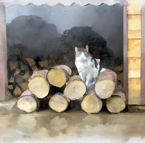 The cat seeks shelter amidst the logs,