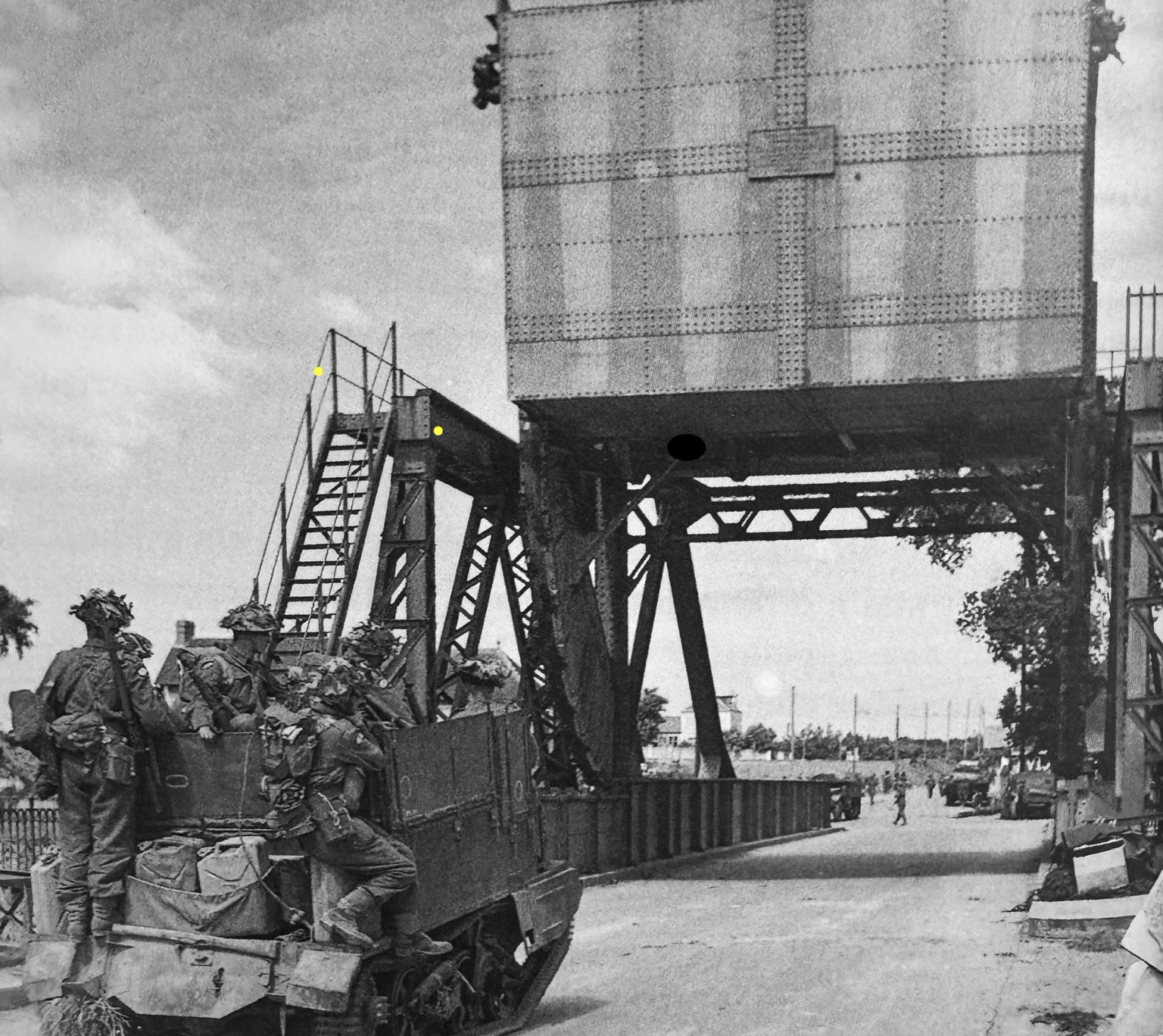 British soldiers hitch a lift across Caen Canal Bridge on a Bren carrier - Caen, France, June 1944. It was renamed Pegasus Bridge on the 26th June 1944 after the winged horse emblem on the uniforms of the British airborne division that captured it. The events were later made into a film in 1961 called The Longest Day #ww2 #worldwar2 #caen #france #pegasusbridge #pegasus #bridge #airborne #thelongestday #dday