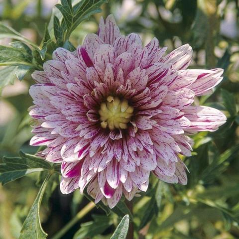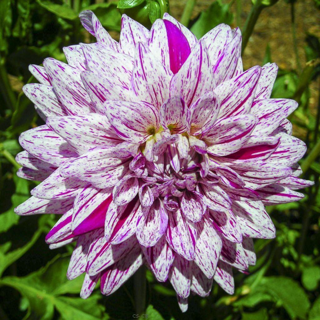 Dahlia Black Berry Ripple ist eine mittelgroße Dahlie mit spitzen weißen Blüten, die mit lila-roten Streifen und Flecken verziert sind.