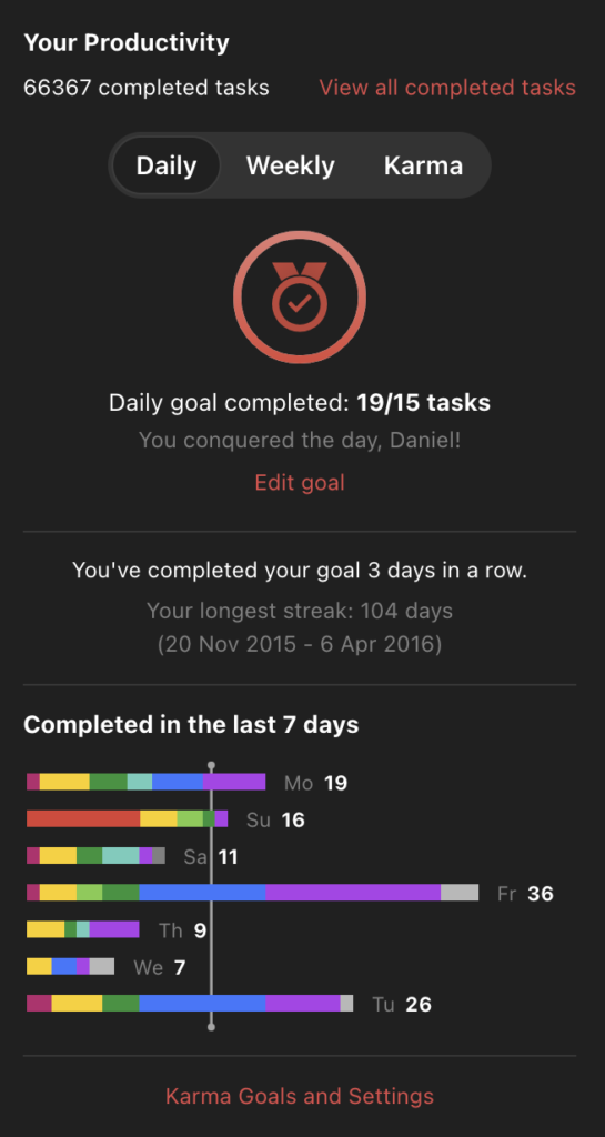 After countless attempts and tests, I finally ended up in a relationship with Todoist. And since then, I have my life under control. I remember it was 2010 – thirteen years ago. Today, I probably know every feature of this app and I completed more than 66’300 tasks in Todoist.