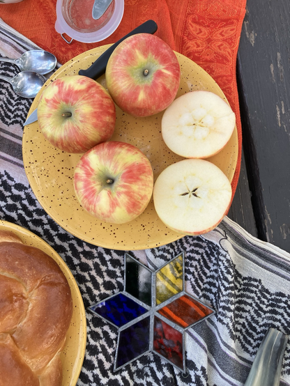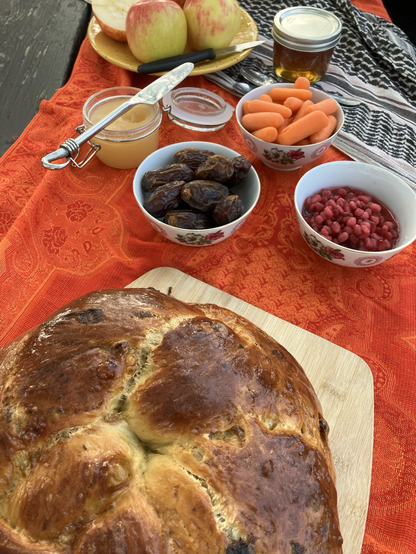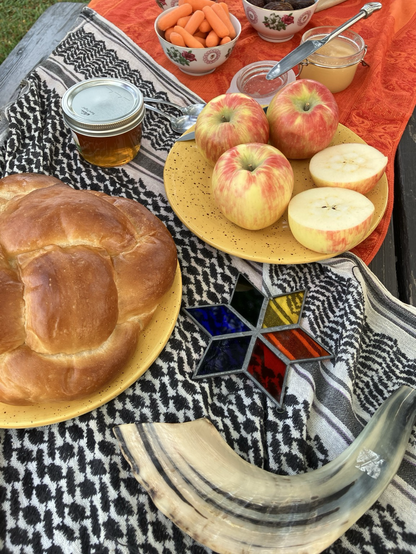 This morning, on what still felt like more of the same bad news of 5785, even if it was already 5786, I woke with the dread of having to actually host tashlich. My friend had had an awful week, and had no capacity to pull anything together. Mostly I just wanted to see them and schmooze+kvetch, and not have the responsibility of holding ritual space, and not reflect on the year past and the year ahead, and not have the constant buzzing of anxiety get that much louder when thinking about what the world will/might look like in 5787. Instead, I borrowed a bright-orange scarf, keffiyeh, and the one queerly Jewish thing I could scavenge from my sister’s apartment where I’m currently cat sitting, and then schlepped to a co-op to get just enough ritual foods to make a picnic table look even remotely like it was ready for this new year—even if I wasn’t.