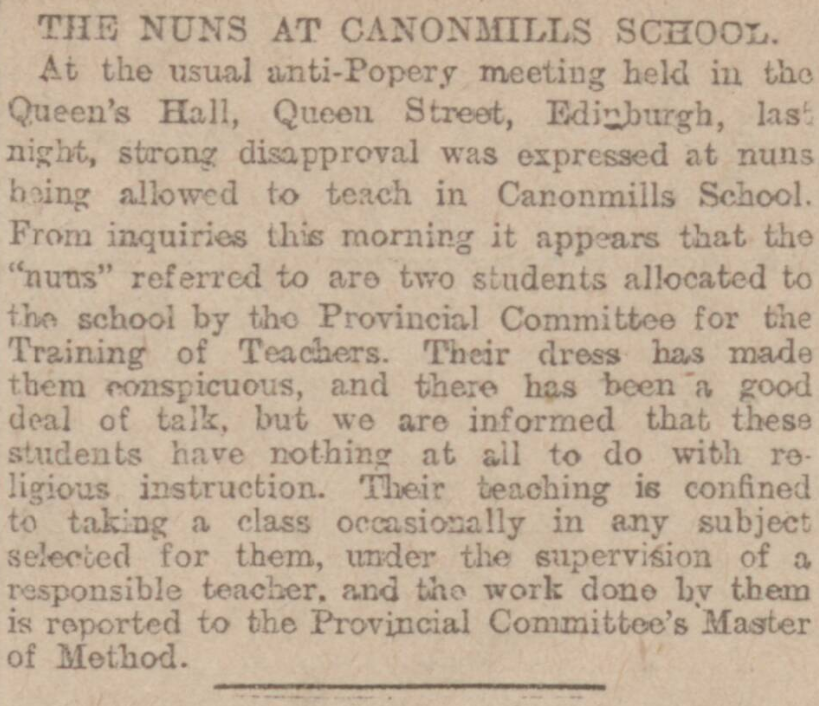 Reporting on the case of the “nuns” at Canonmills School. Edinburgh Evening News, November 23rd 1908