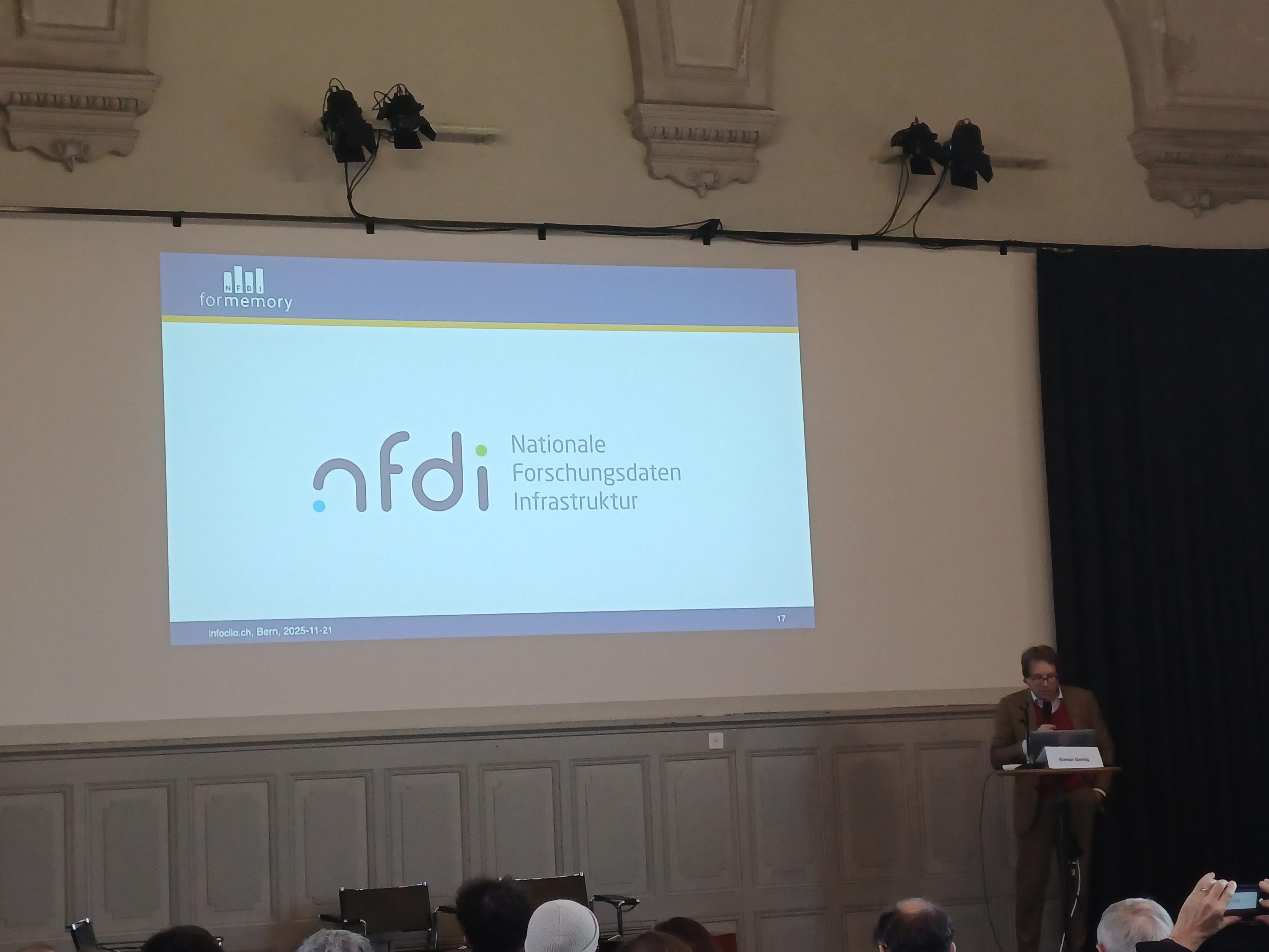 Simon Donig presents the German national research data infrastructure and especially the Humanities consortia @NFDI4Memory @nfdi4culture @nfdi4objects @Textplus 🍀 . One of the aims Prevent "Gollumination" (my precious) of research data #NFDIrocks #openscience #digitalhumanities #rdm