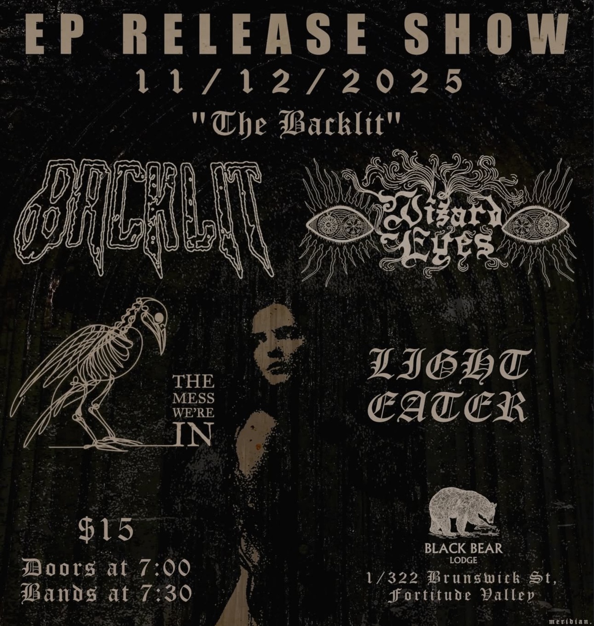The official launch show for Backlit's debut EP - titled "The Backlit", released on 31/10/2025. Backlit brings their noisy, chaotic energy to their first headlining show, playing their EP and more in celebration of its release. The boys are joined by the knuckle-dragging doom metal gurus "Light Eater" and the alternative rock dynamism of "The Mess We're In". The night will be concluded by the gravitational force that is "Wizard Eyes". Wizard Eyes will also be launching their first single as a full band - Transcending Humanity. Join us for a night of doom, sludge and atmosphere - this is one to remember.