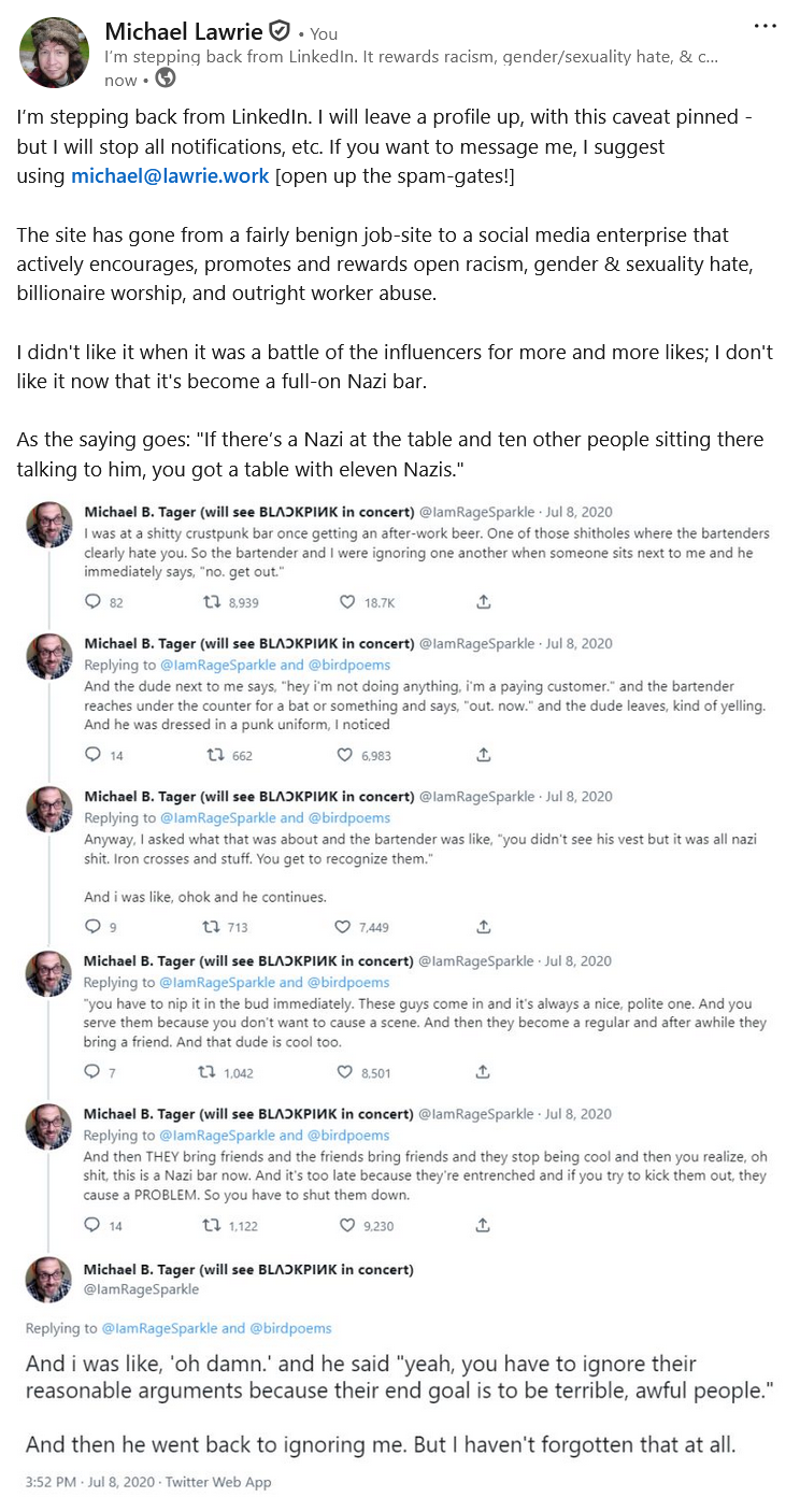 #LinkedIn has become a #NaziBar - And it's not even useful any more. So bye, Felicia!