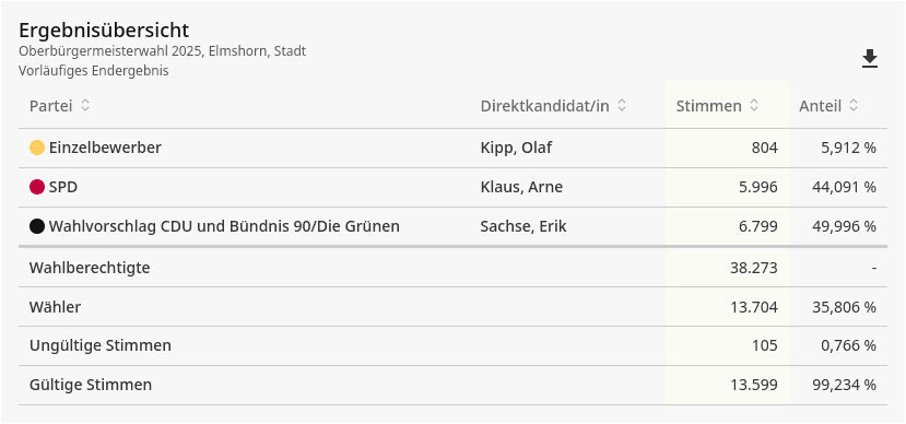 In #Elmshorn gibts (vorläufig) eine #Stichwahl, weil der Führende ½ Stimme weniger als die Hälfte hat. Ist hier zwar noch halbwegs knapp, aber eine Stichwahl in solchen Fällen ist schon Overkill. Je nach Vorsprung könnte man auch weniger als 50 % reichen lassen.