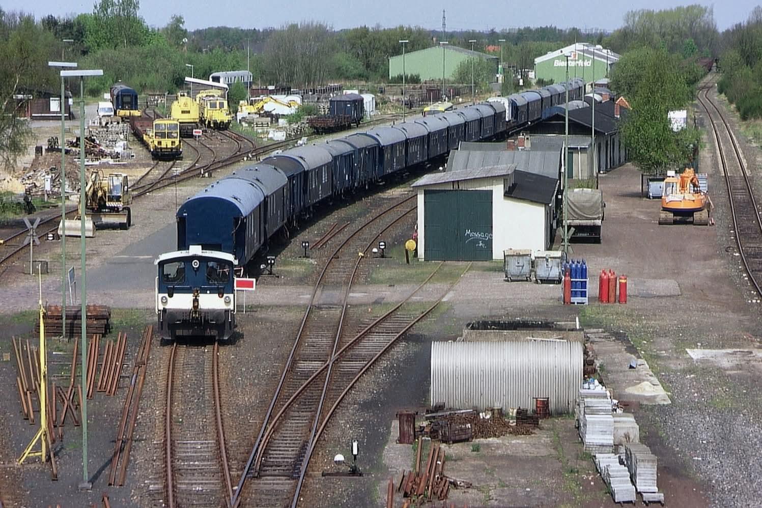 332 208 steht am 09.05.1991 in #Elmshorn vor reichlich #Bauzugwagen, hauptsächlich Umbaudreiachser und gedeckte Güterwagen. Weiter hinten fällt noch ein Vorkriegsvierachser auf, ich konnte ihn aber nicht identifizieren. Hinten bereichern ein Skl, ein Kran und eine Stopfeinheit die Kulisse.