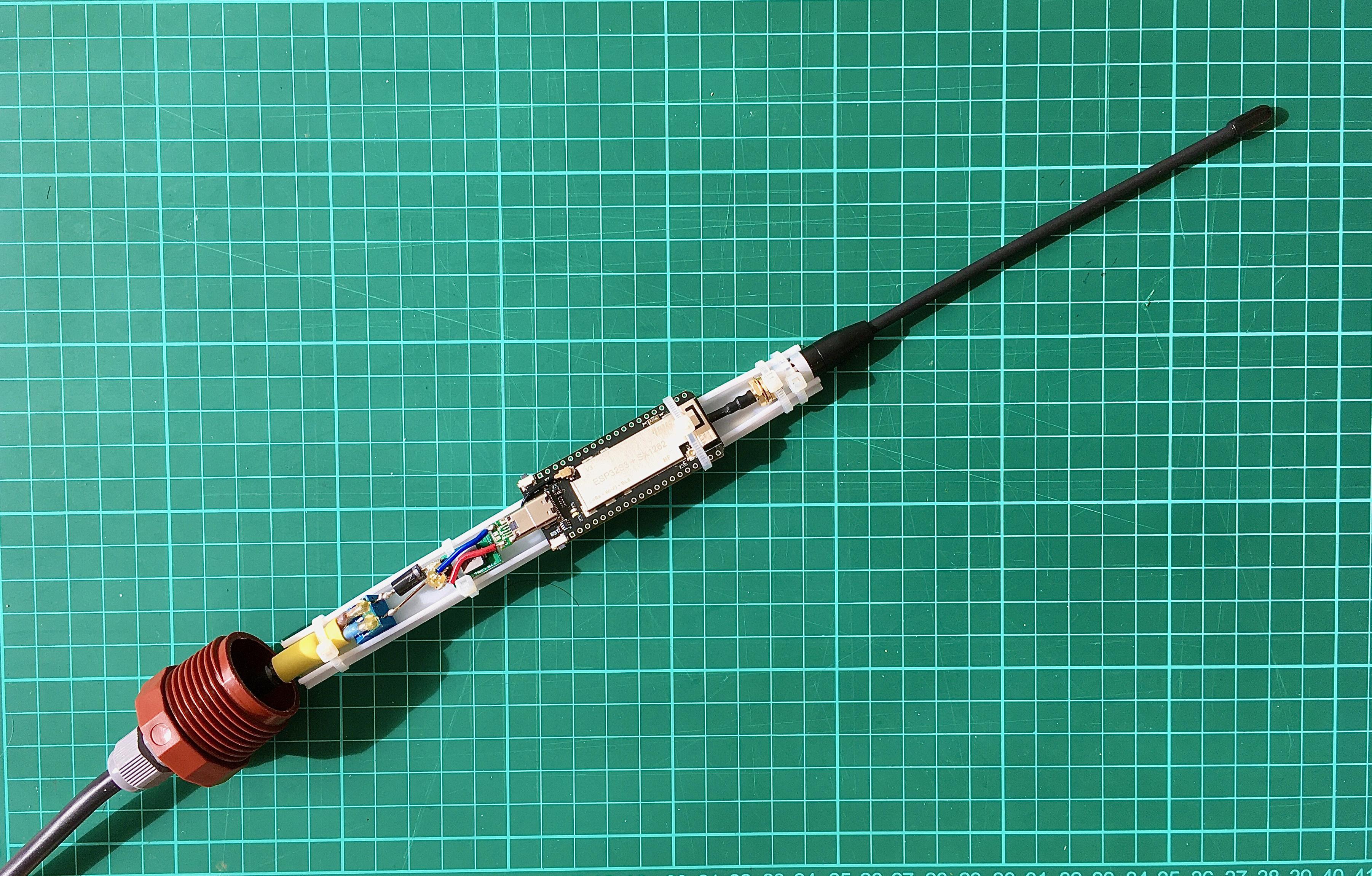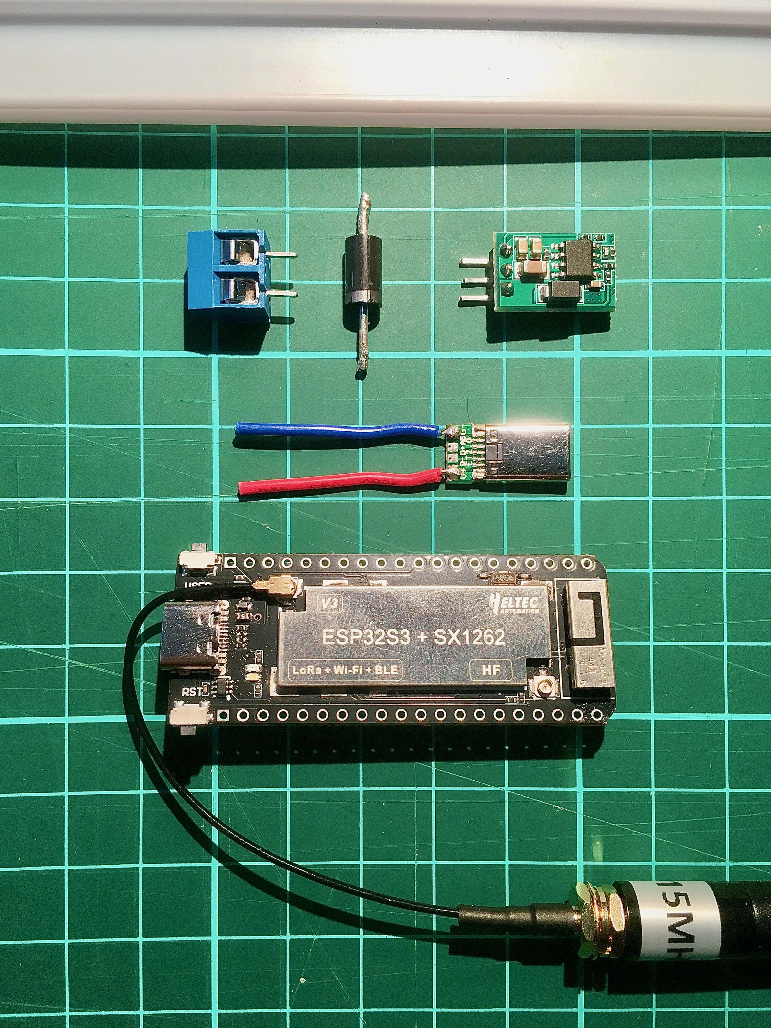 Inside the case is a Heltec Wireless Stick Lite V3 board, with a 915 MHz antenna from Gizont and a 5V step-down regulator from Eletechsups.